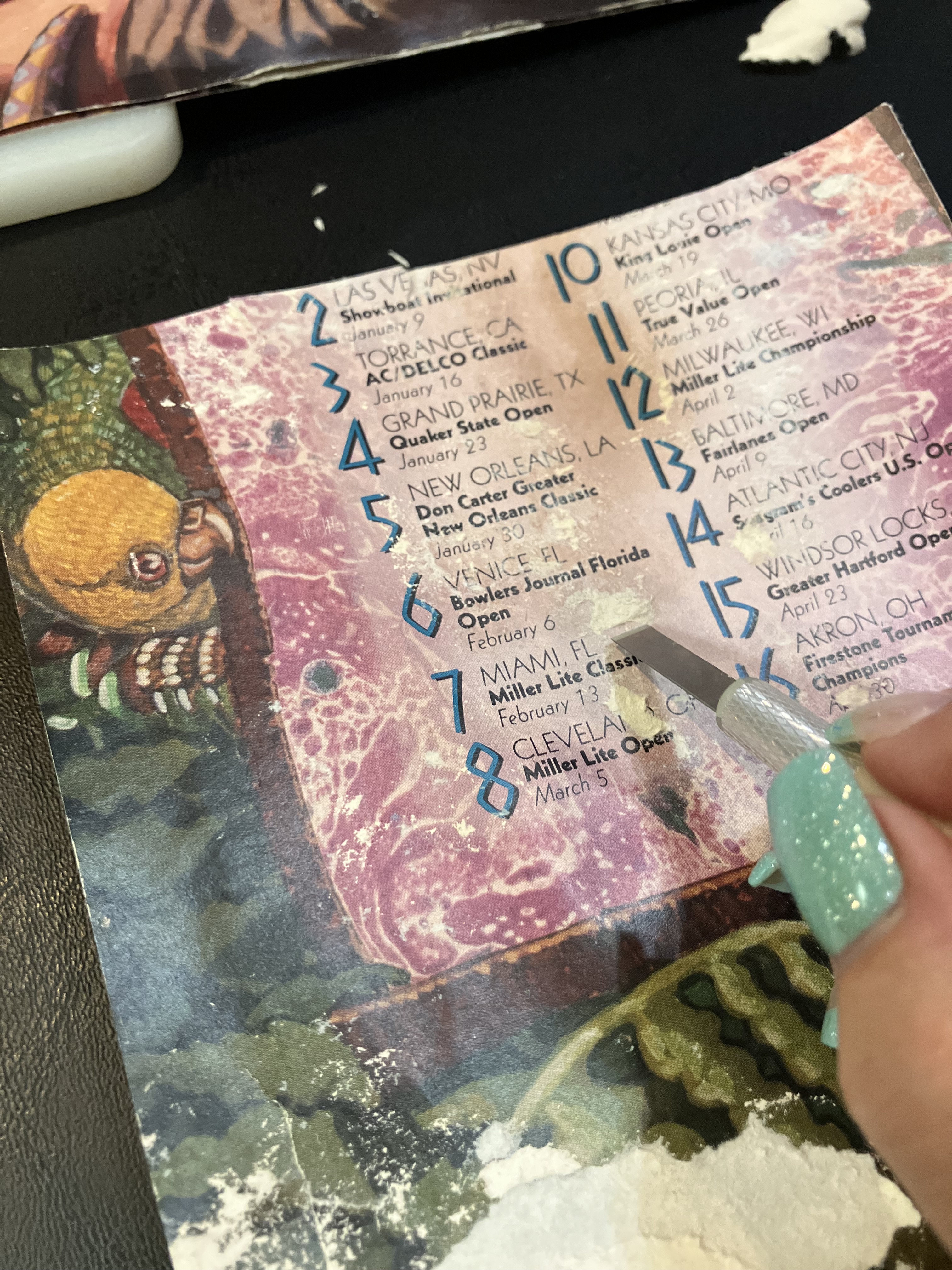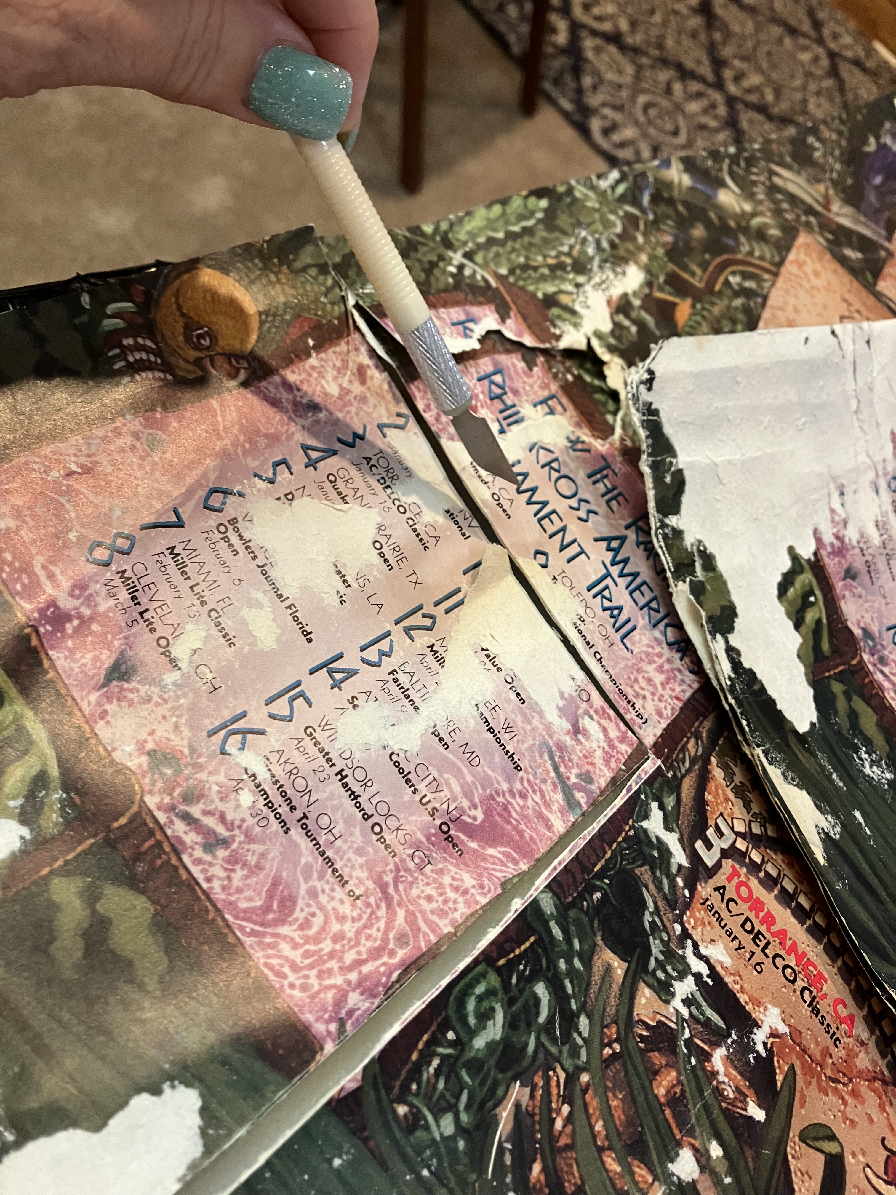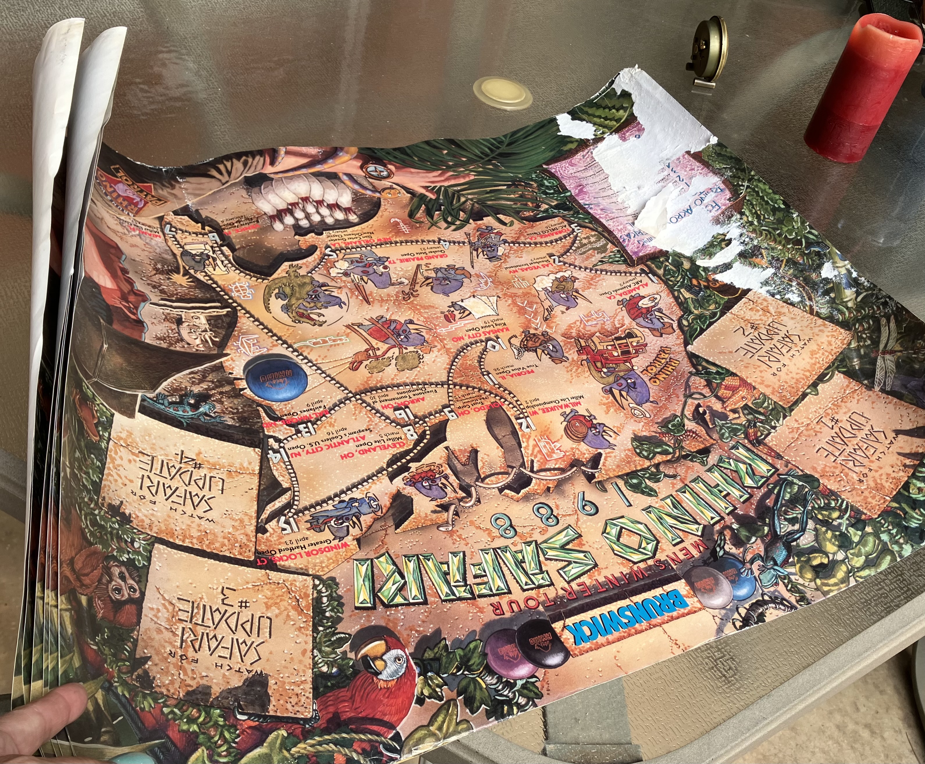 We did a bit of DIY restoration! Using a handheld steamer, we got the posters unstuck, although not completely! After deciding which poster will give a good image, another poster that had a better image of the pink tour date list was cut with an Exacto knife. Other posters were used to cover up imperfections (you can see this in the monkey slide).