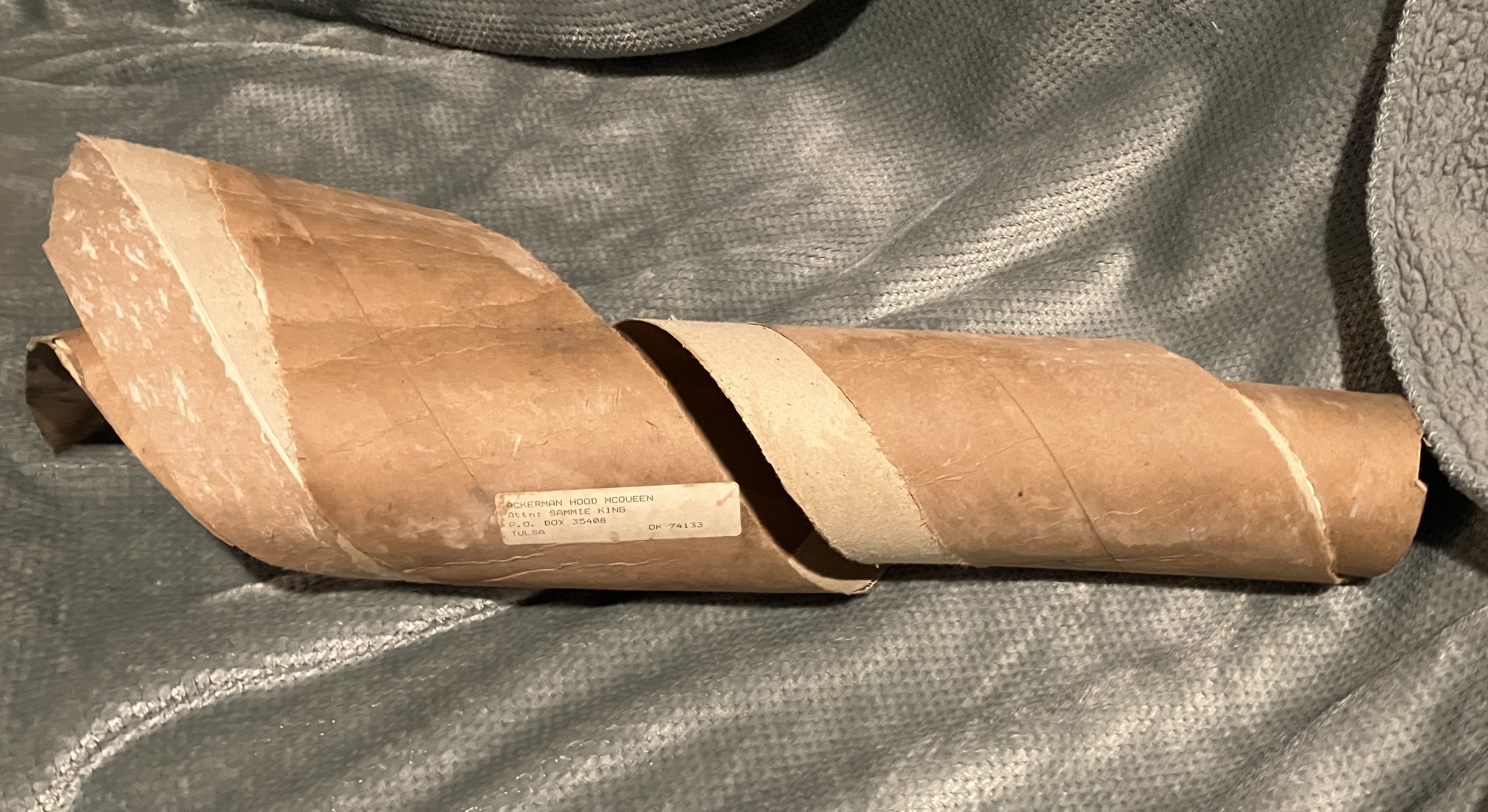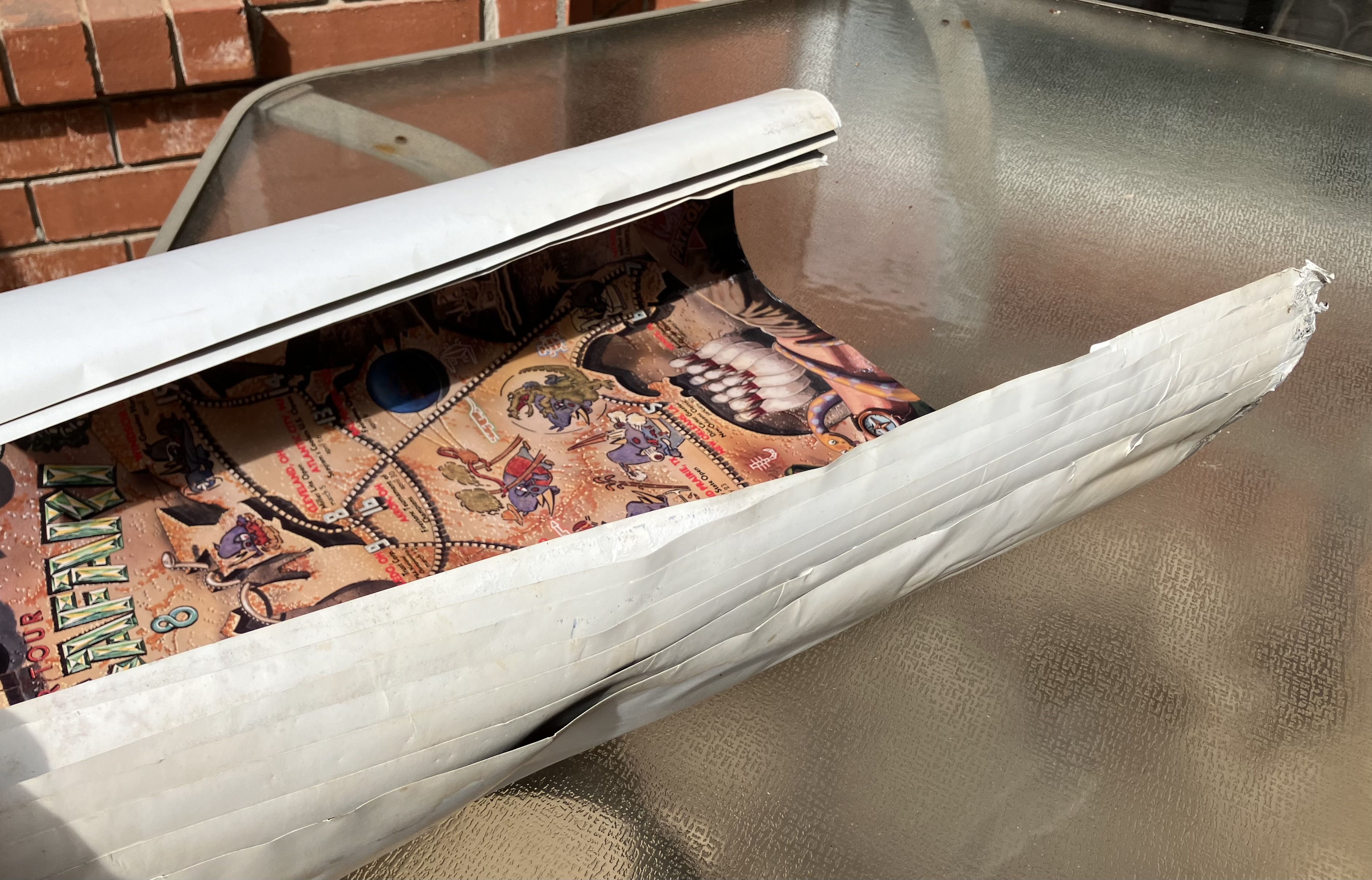 A tube was discovered but the contents would not come out. So, with the help of scissors, seven posters were removed. They were stuck together in the bottom left.