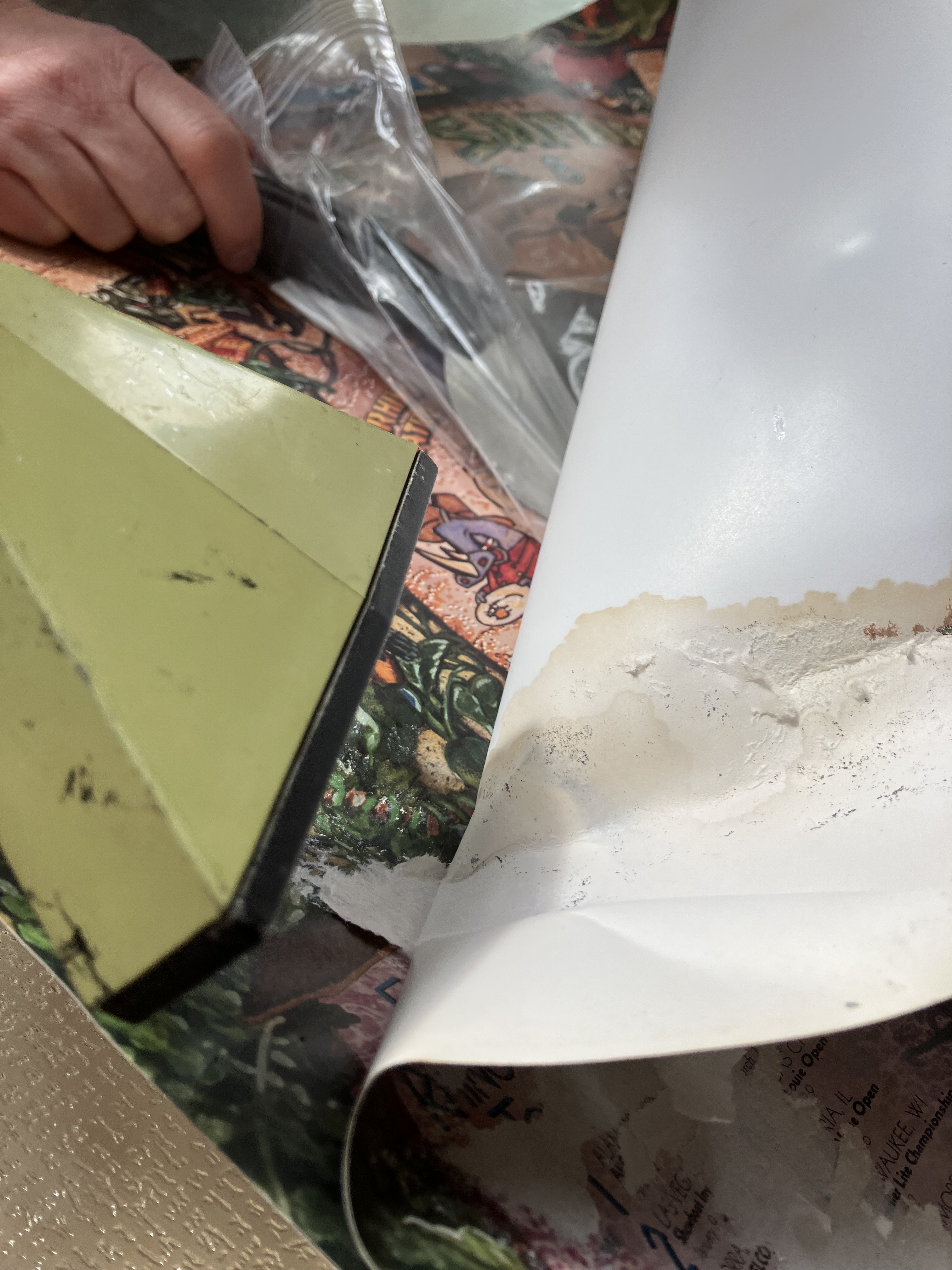 If you move the screen to the right, you can see the other poster peeking out below the top one. I decided to leave it the way it is. You will also notice I attempted to clean up the bottom left corner. I accidentally covered over the printing date AND there is more printing above it!