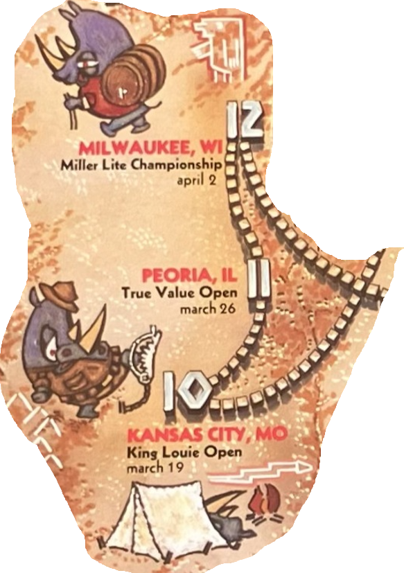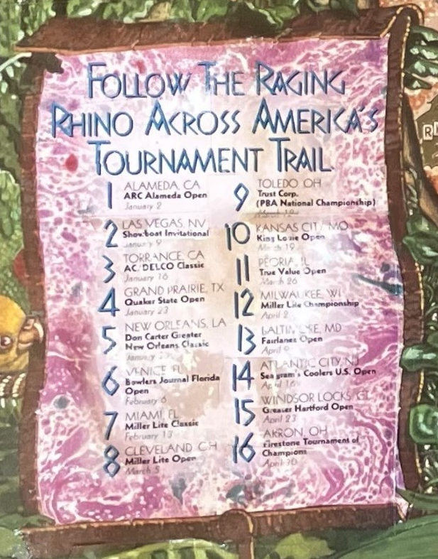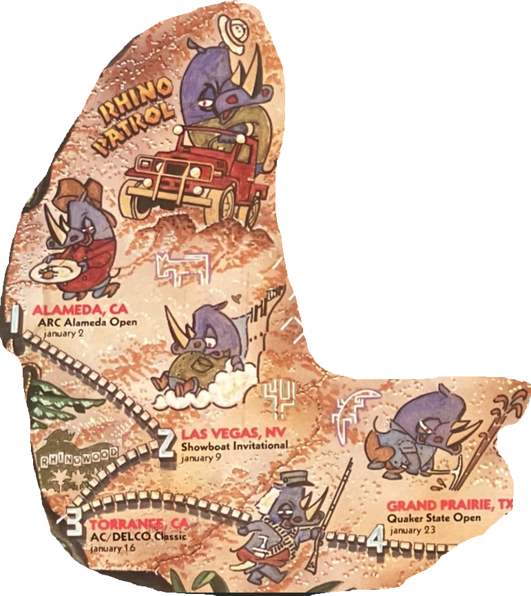 Deane was commissioned by Ackerman, Hood, and McQueen Advertising Agency in 1987 to design a poster for the 1988 Brunswick Men’s Winter Tour Rhino Safari.