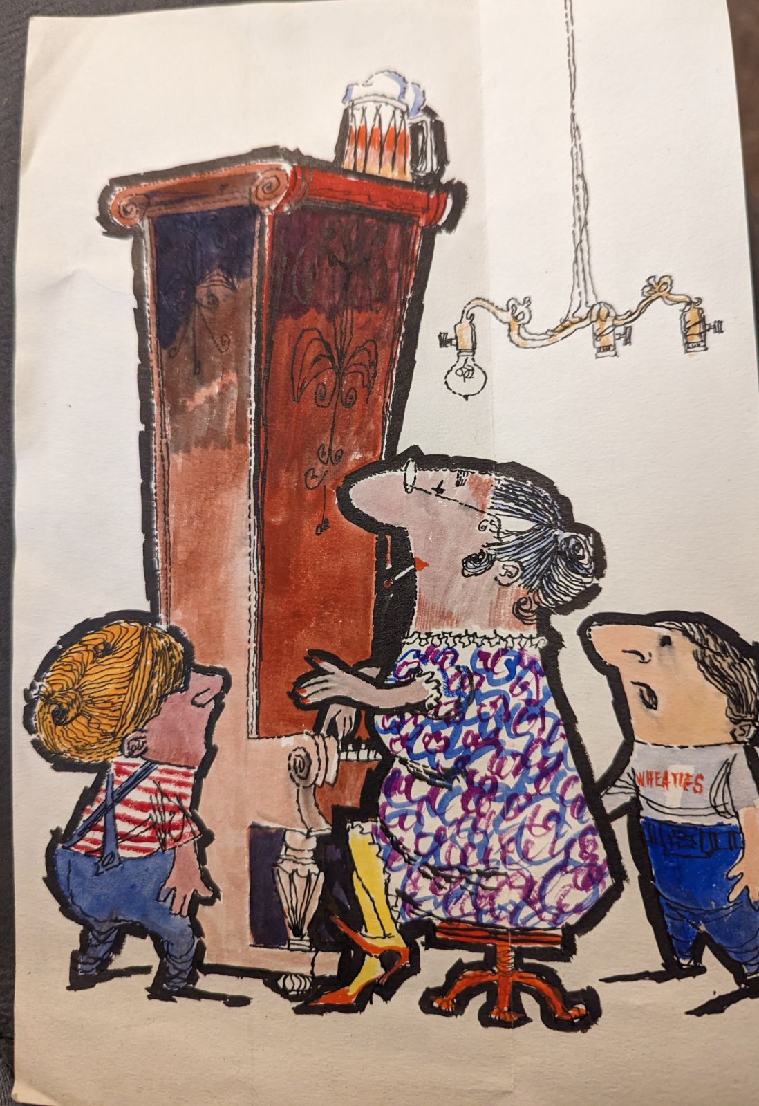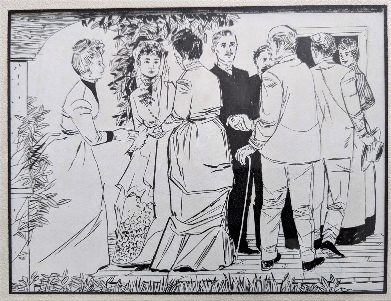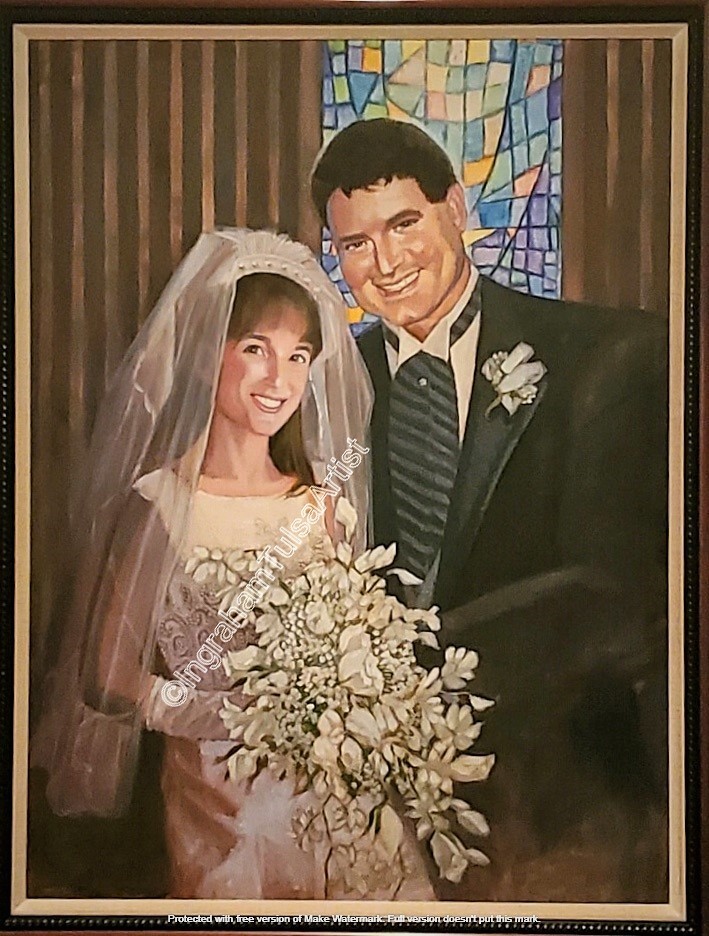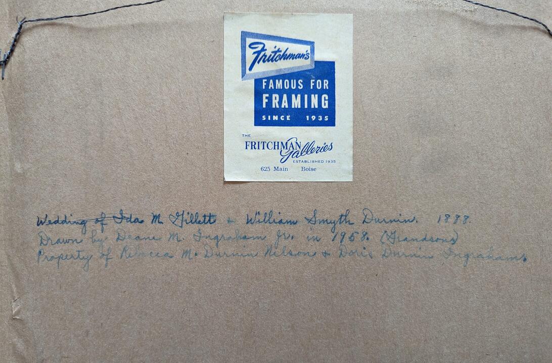 Deane recreated an 1888 wedding scene of his grandparents. He would’ve been in Tulsa by the time he made this, 1958. The back of the frame was not written by Deane because of the way he is identified (Deane was not a junior, his middle name is William and his father’s middle name is Martin). “Wedding of Ida M. Gillett & William Smyth Durnin. 1888. Drawn by Deane M. Ingraham Jr. in 1958. (Grandson) Property of Rebecca M. Durnin Nilson & Doris Durnin Ingraham.”