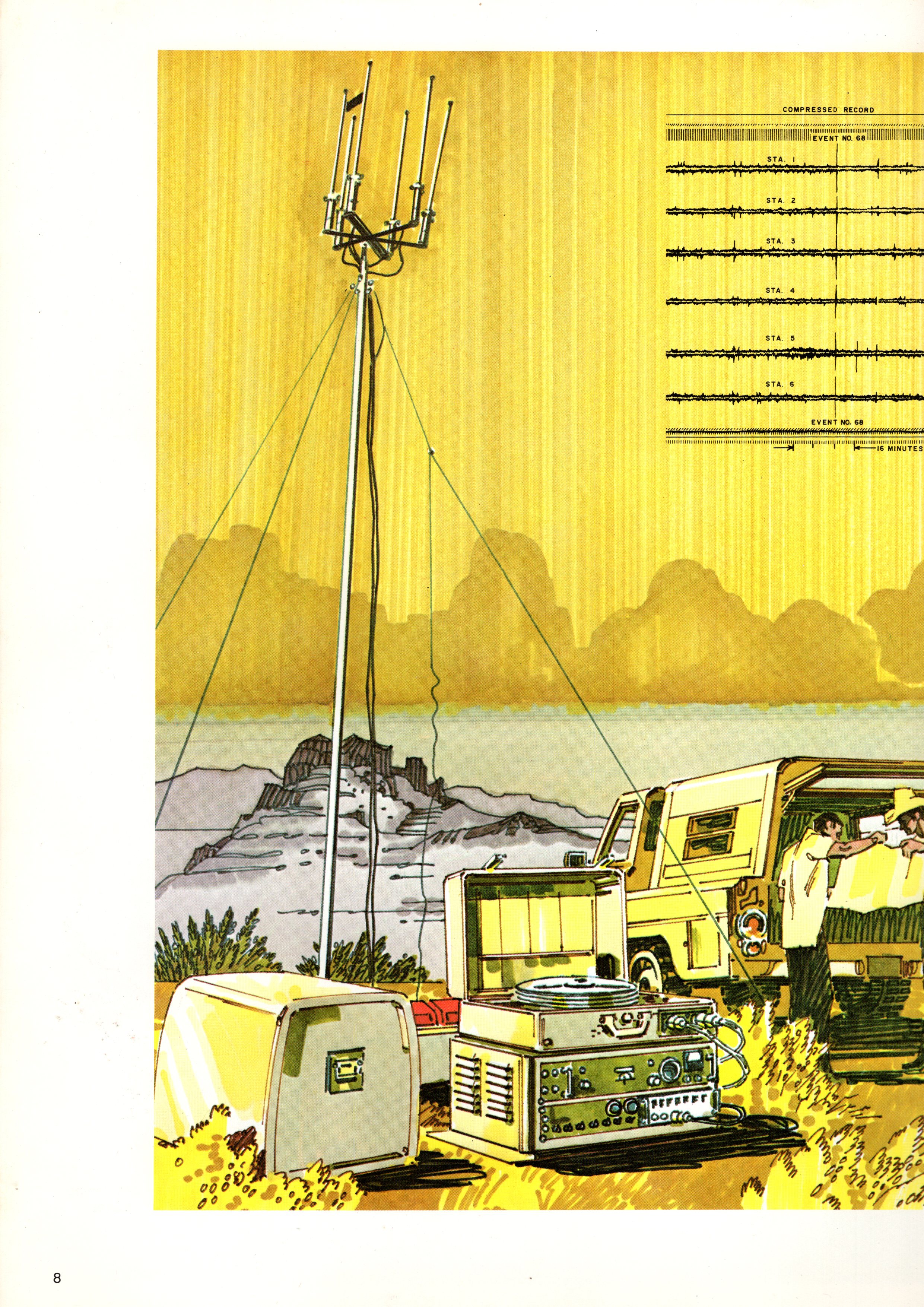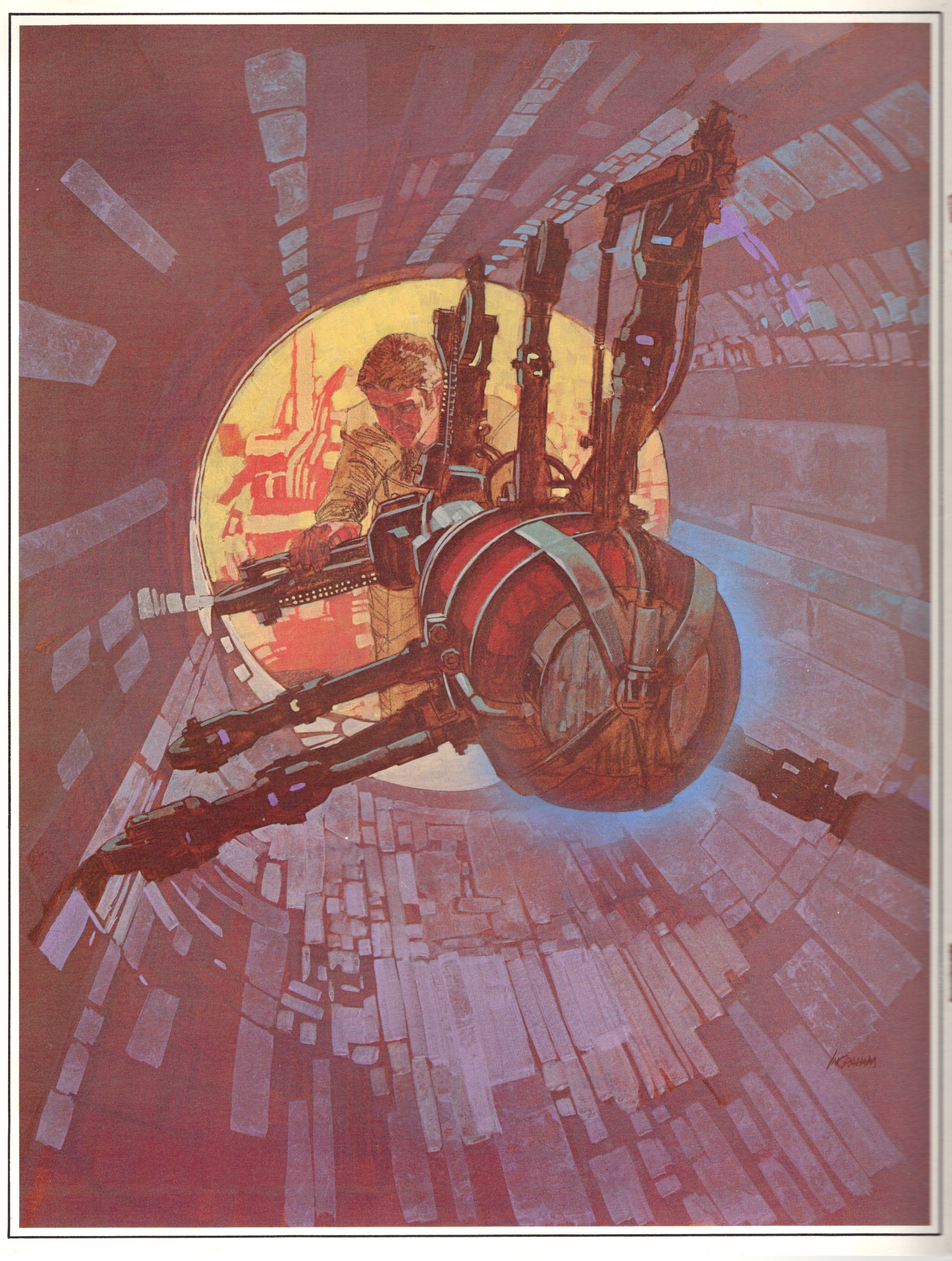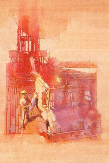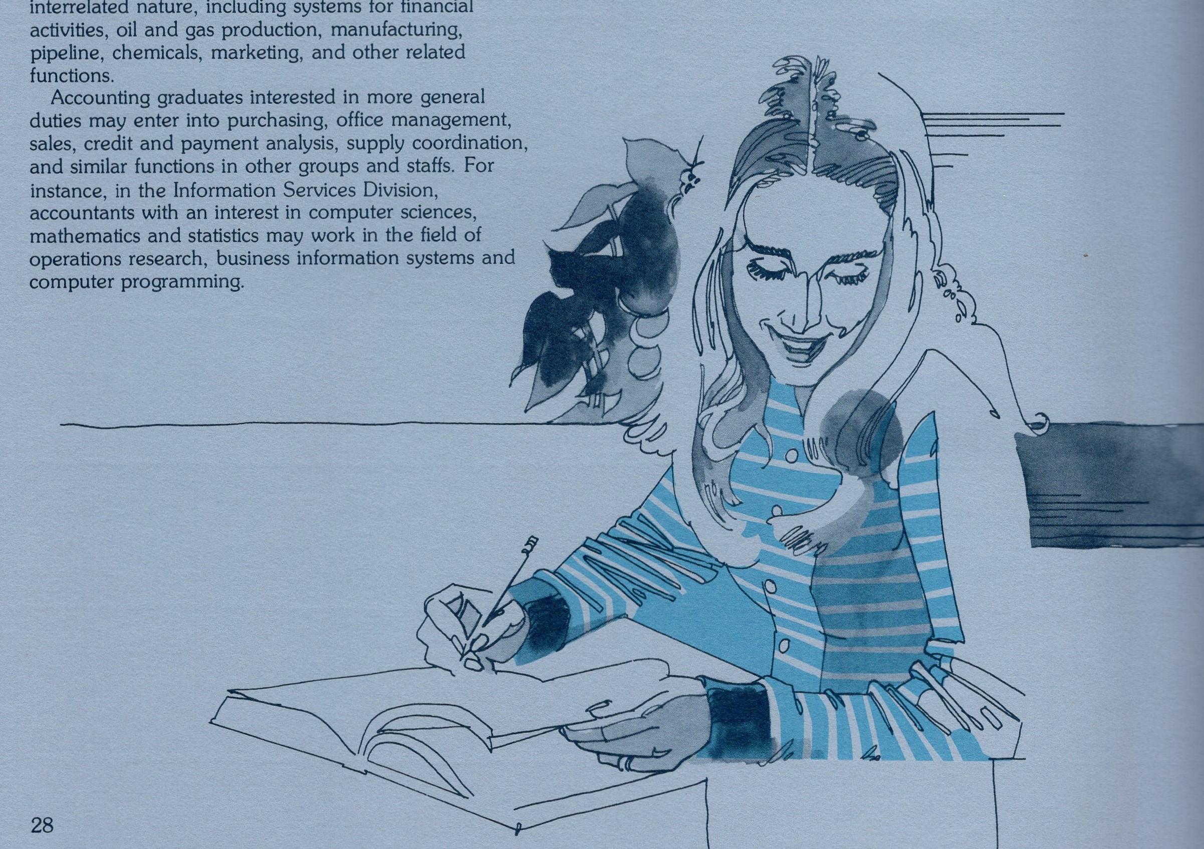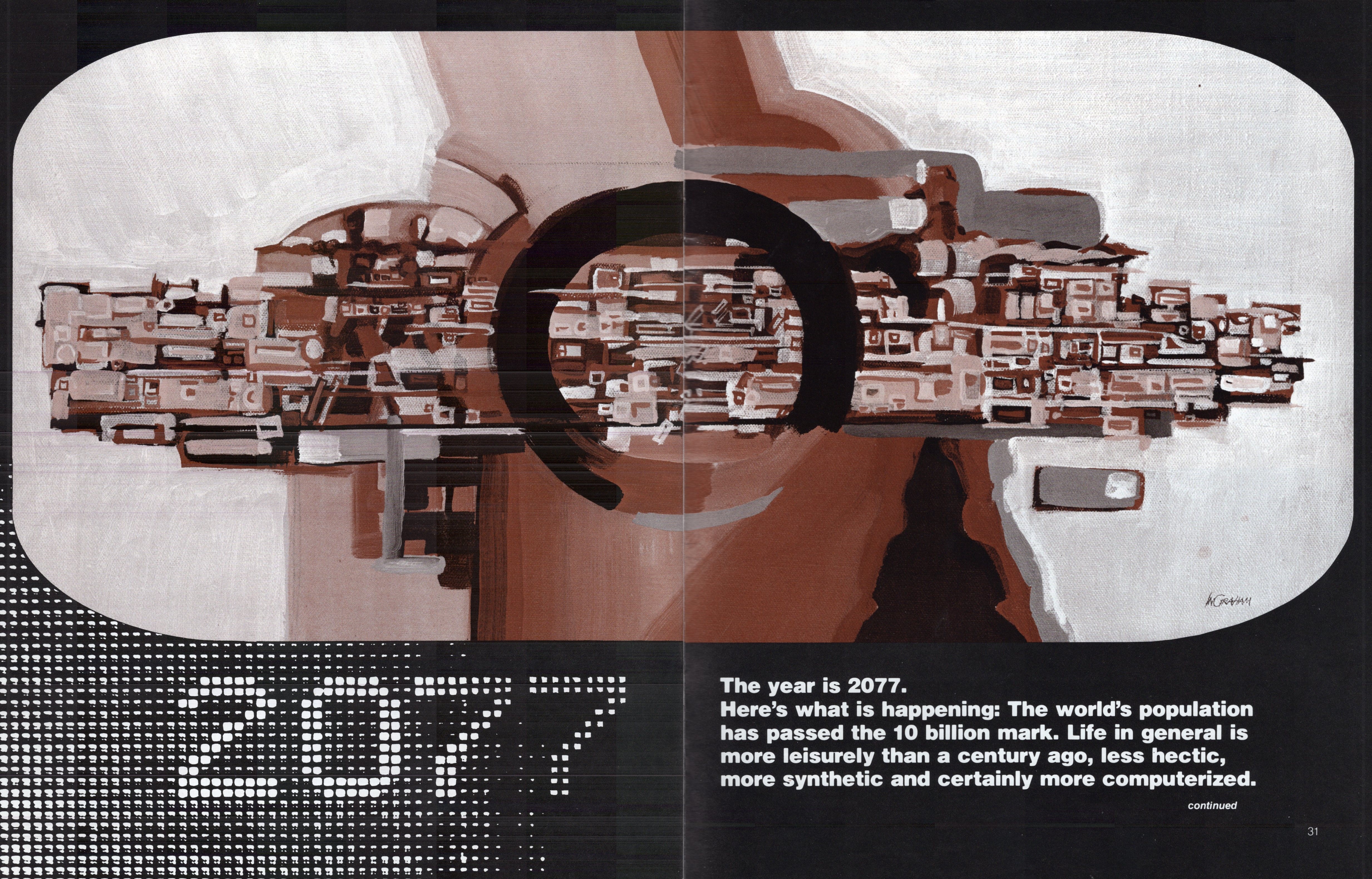 Below, from Phillips magazine Shield, First Quarter 1977; pgs 30 – 31, 32 – 33. The artwork, an abstract, is unique. Deane didn’t paint abstracts. This is signed. I have yet to call the Phillips Museum to ask if the painting is on display or in storage somewhere. The article muses over how petroleum is used 100 years from 1977. The words on the right side of the first image reads, “The year is 2077. Here’s what is happening: The world’s population has passed the 10 billion mark. Life in general is more leisurely than a century ago, less hectic, more synthetic and certainly more computerized.”