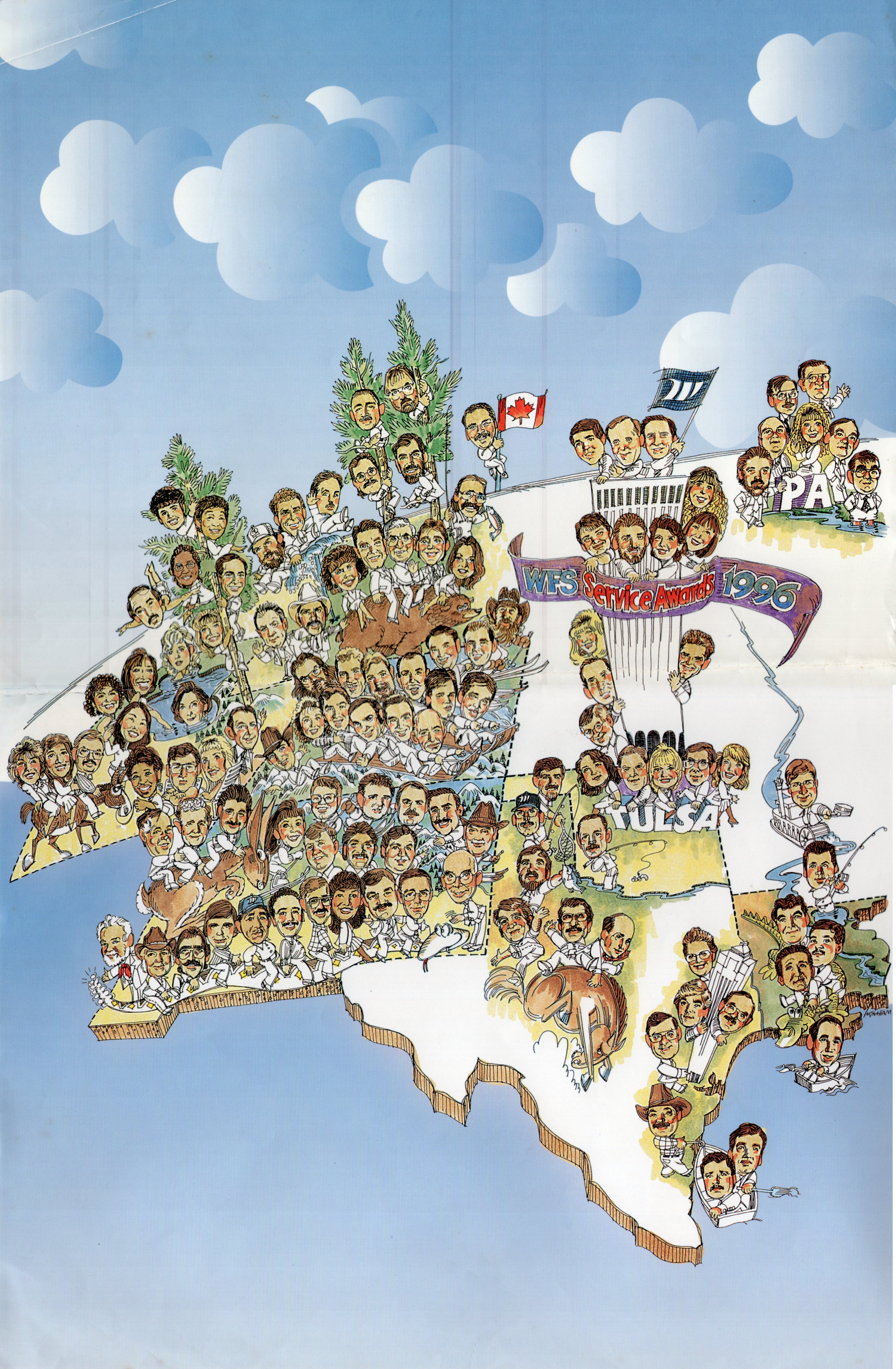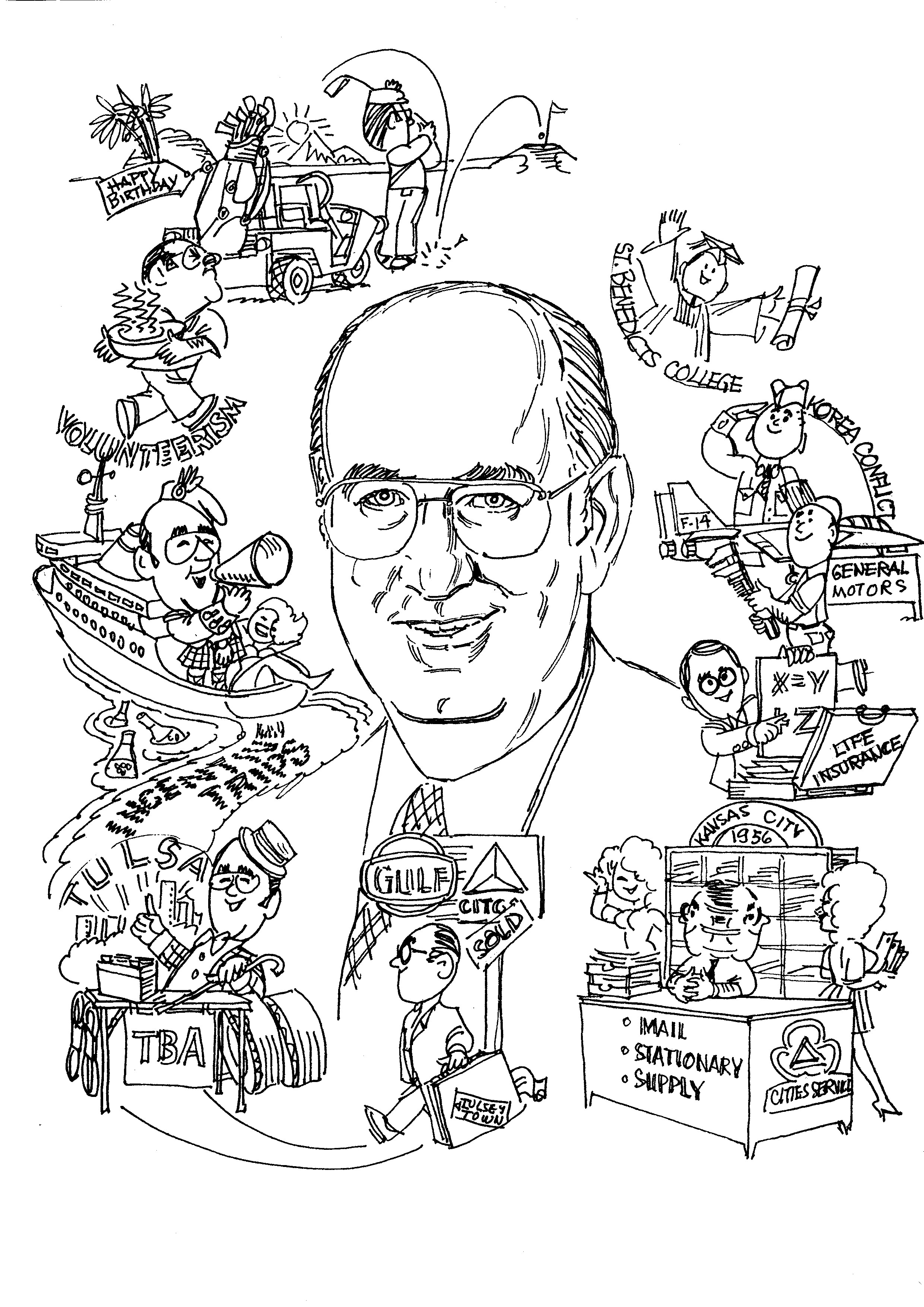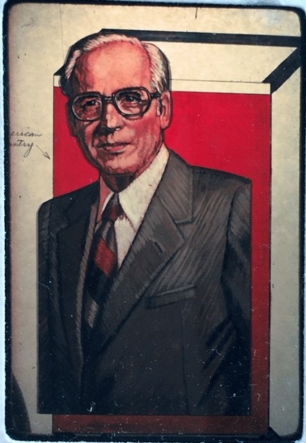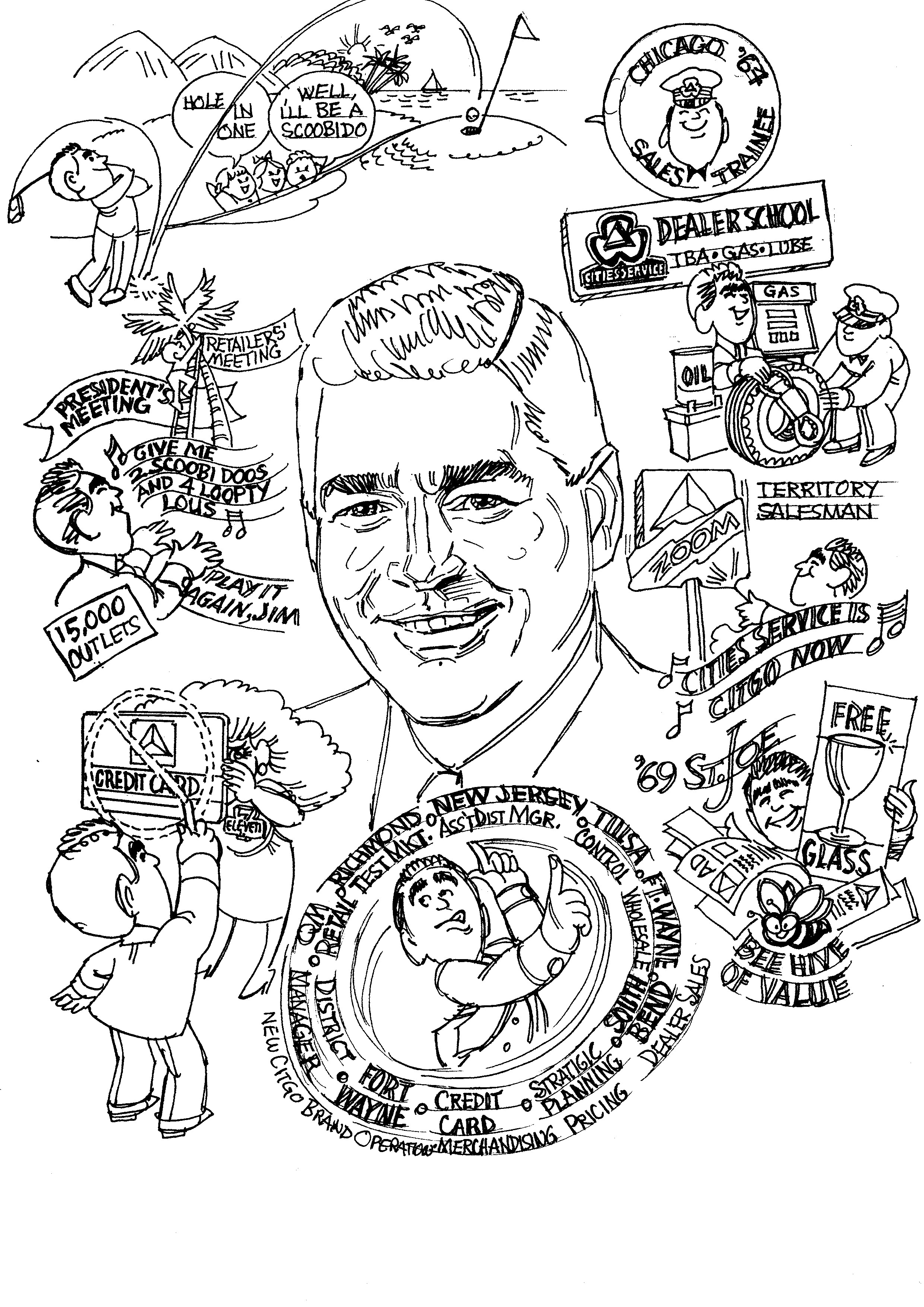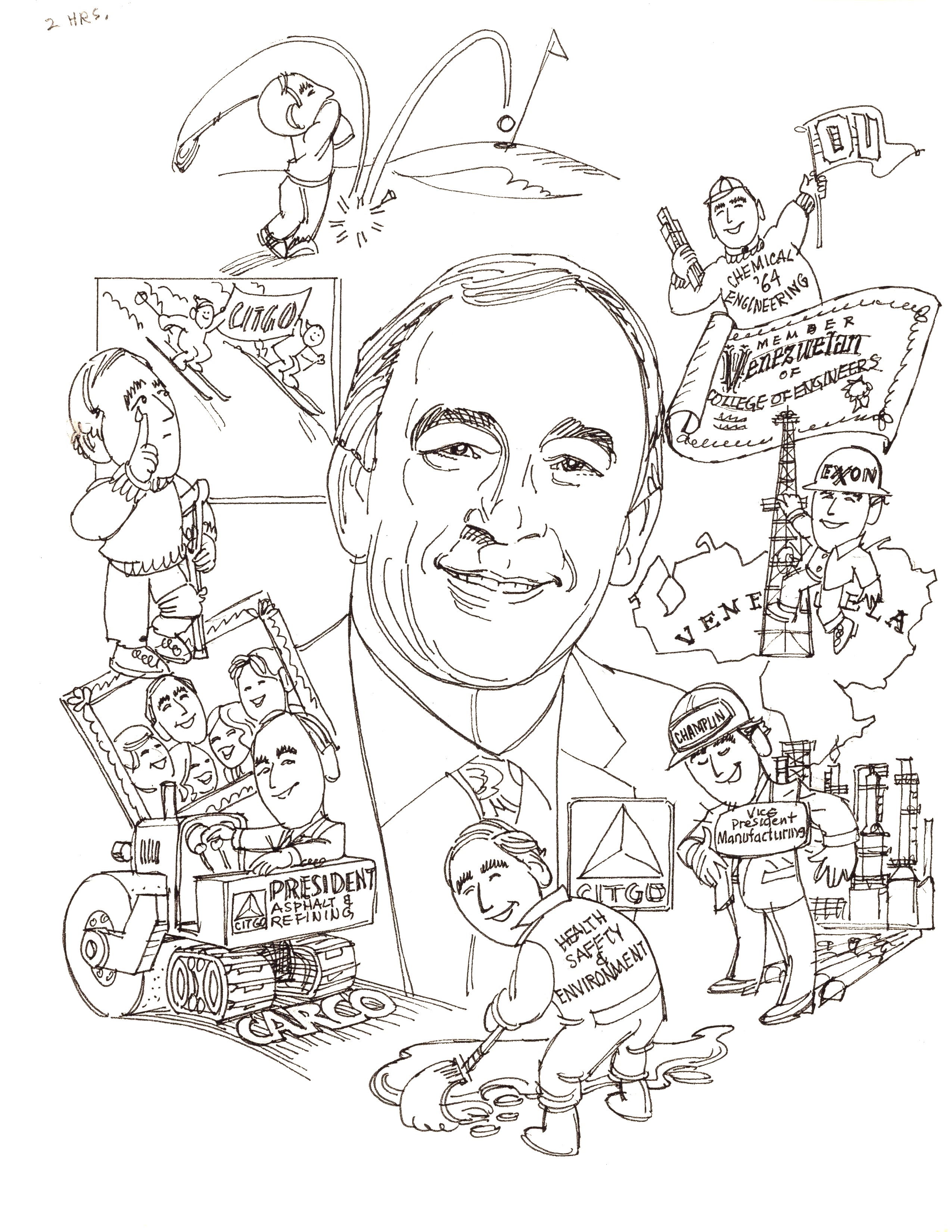 Deane was hired to make portraits for Citgo personnel. I don’t know how many he painted. Two prints of those portraits were found. Kenyon had a portrait made in the same style; he was possibly being used as a ‘test portrait.’ You can view Kenyon’s portrait in the Eighties/Nineties Gallery under Family. The other collages were tributes to longtime employees, dated 1999.