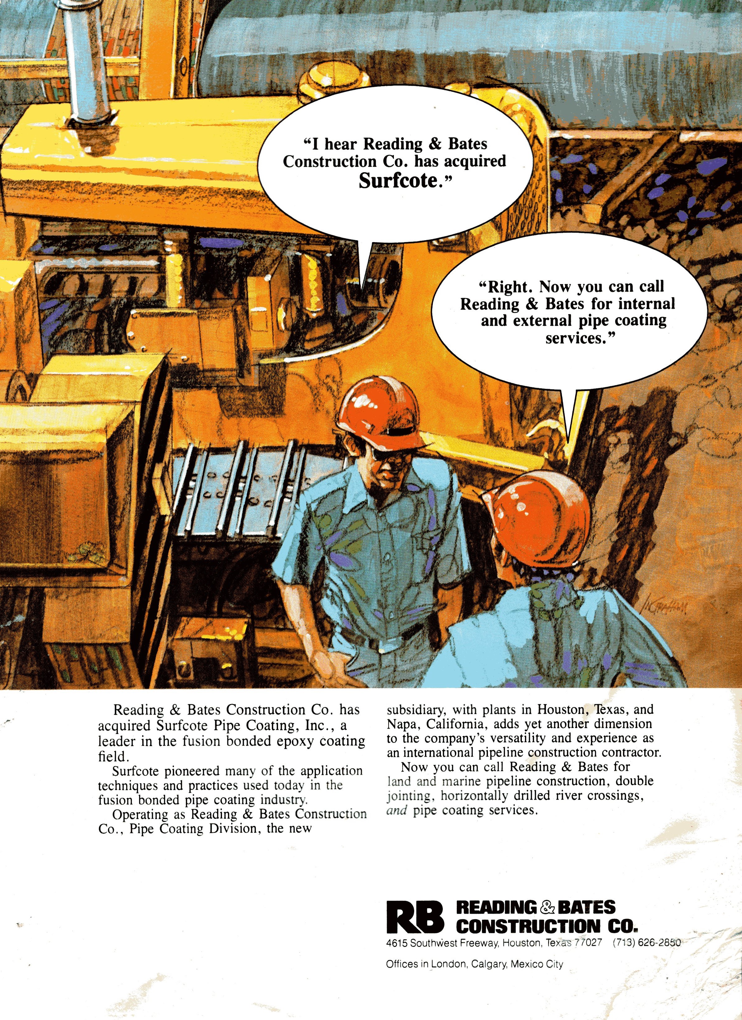 Reading and Bates Construction Co. had a long history in Tulsa. They helped build the top half of the Mid-Continent Building and occupied a few of the upper floors. They moved to Houston in 1989 and operate now as land and marine pipeline construction.