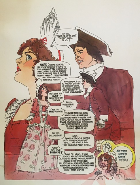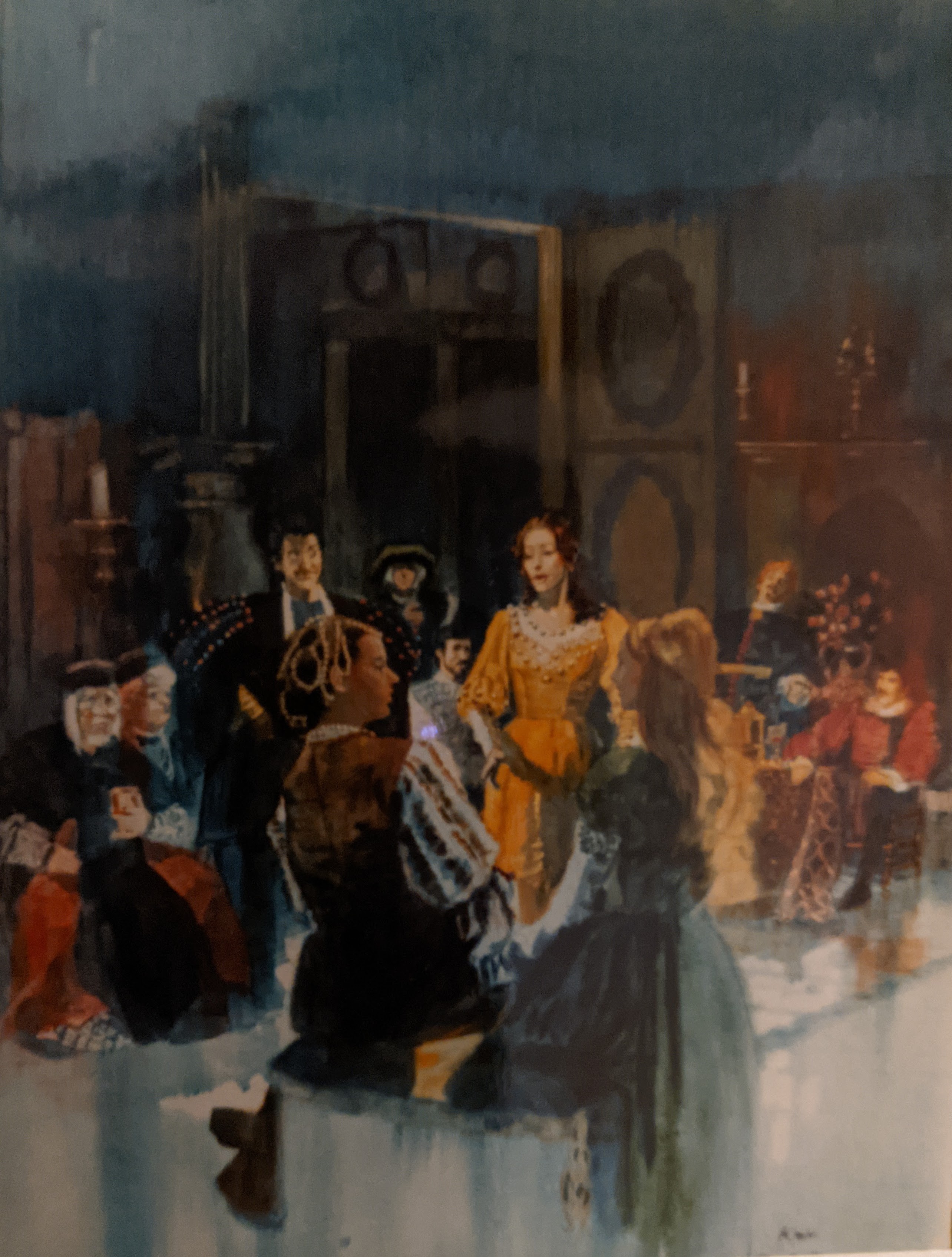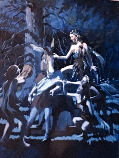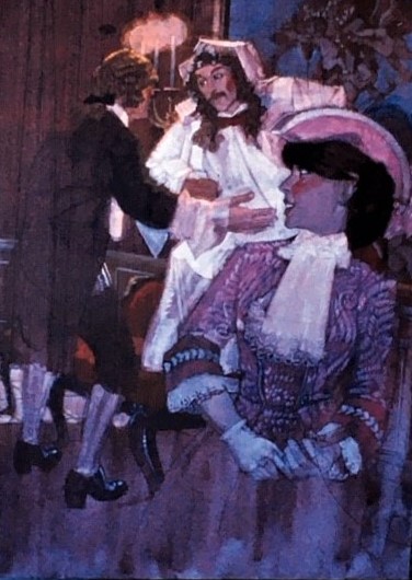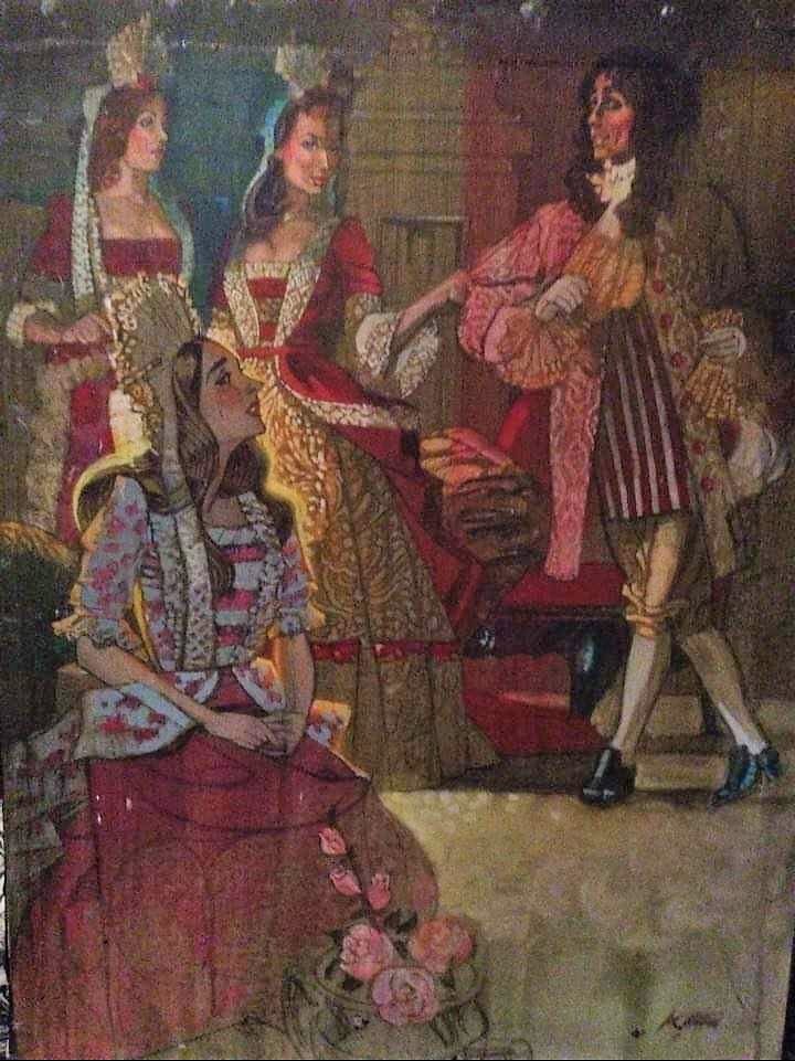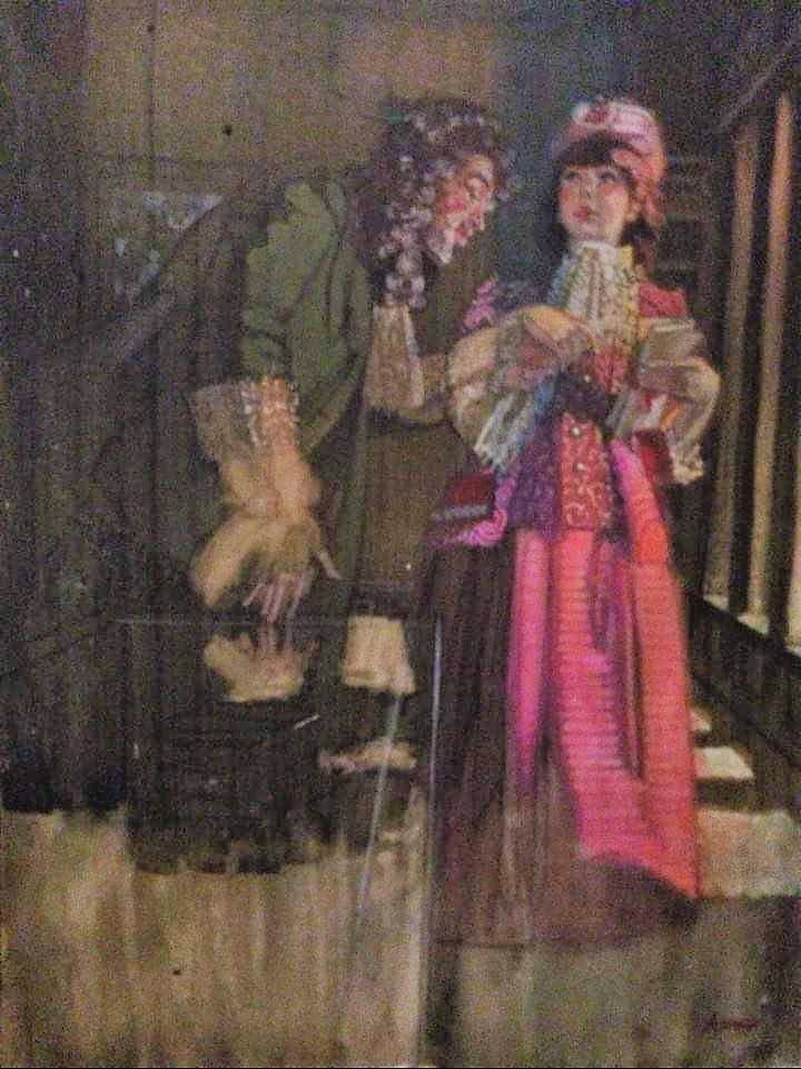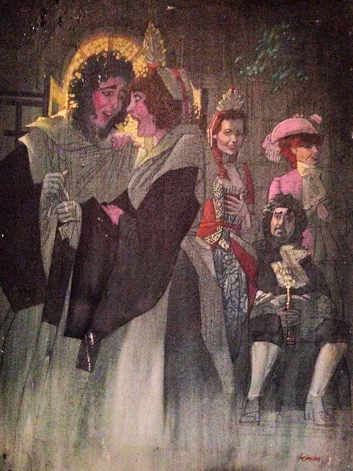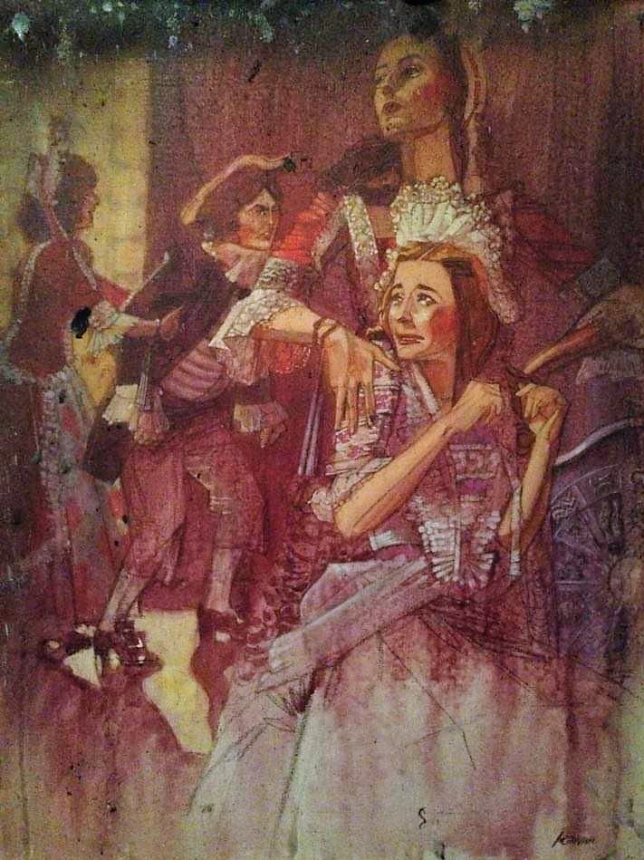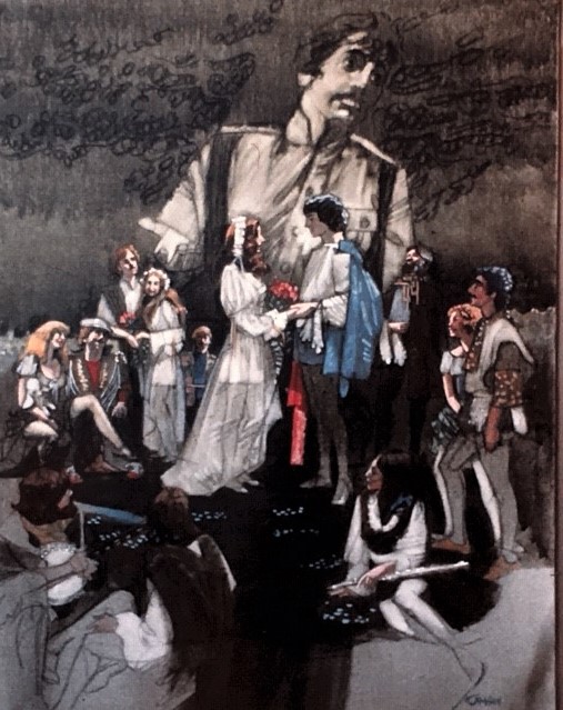 The paintings . . . Many of the images came from slides taken by Deane in the late-70s. But kudos to Shana and Kelsey for rescuing some paintings from the fire’s rubble. It is easy to tell the ones that have yet to be restored! Picture 1 is from The Taming of the Shrew. The two below it are from As You Like It. The others are all Love for Love. Kay reports, “I remember that the background of the Taming of the Shrew painting was made up of the gold wrappers on candy bars that Anne was selling for school or maybe Rainbow (Masonic youth organization for girls). Probably the only time our parents bought a lot of that candy! I think one of the actors or the director got the actual painting.” Note, I don’t I have a copy of that painting, but it looked like the program cover.
