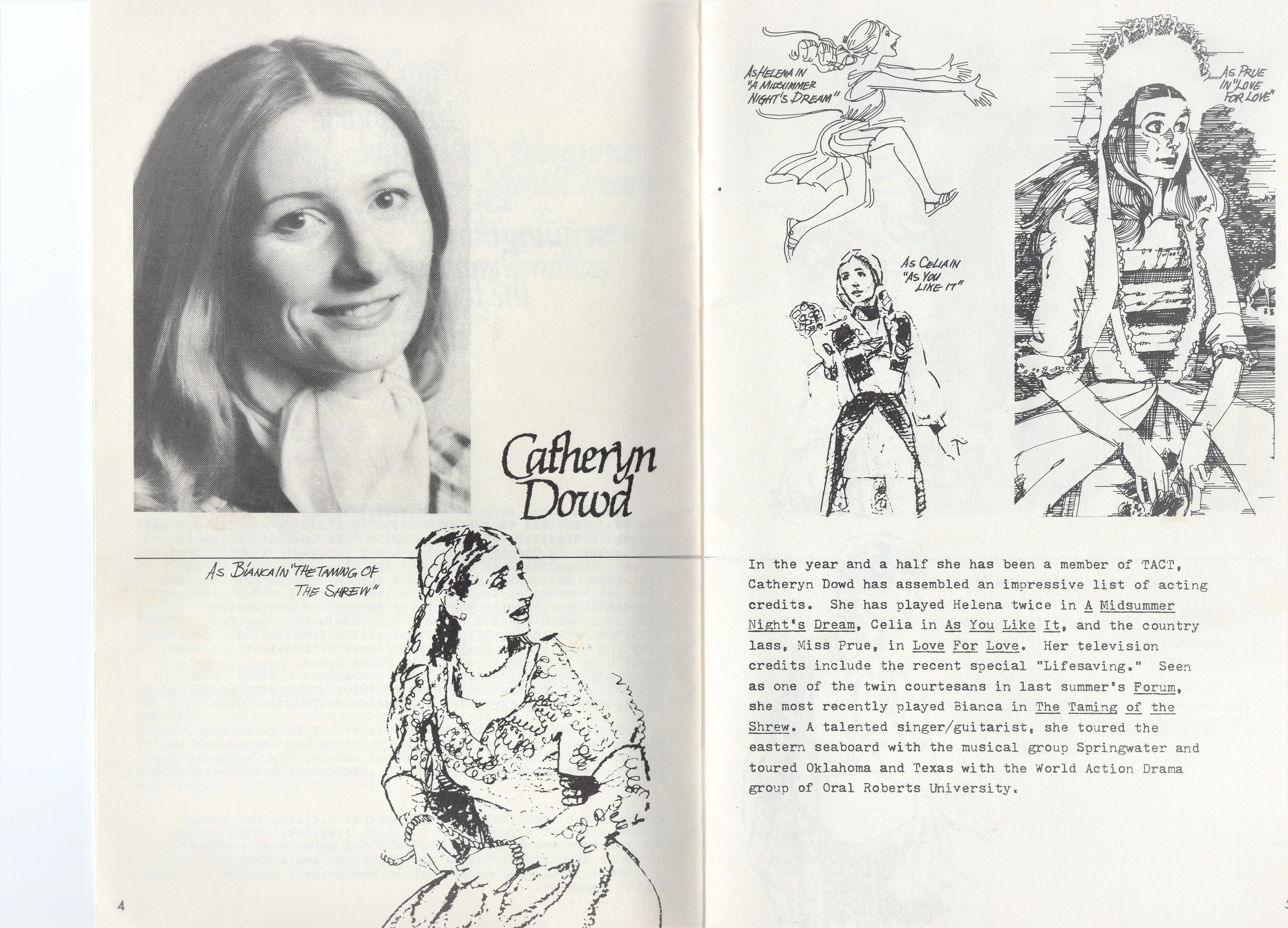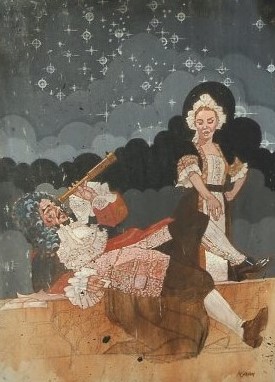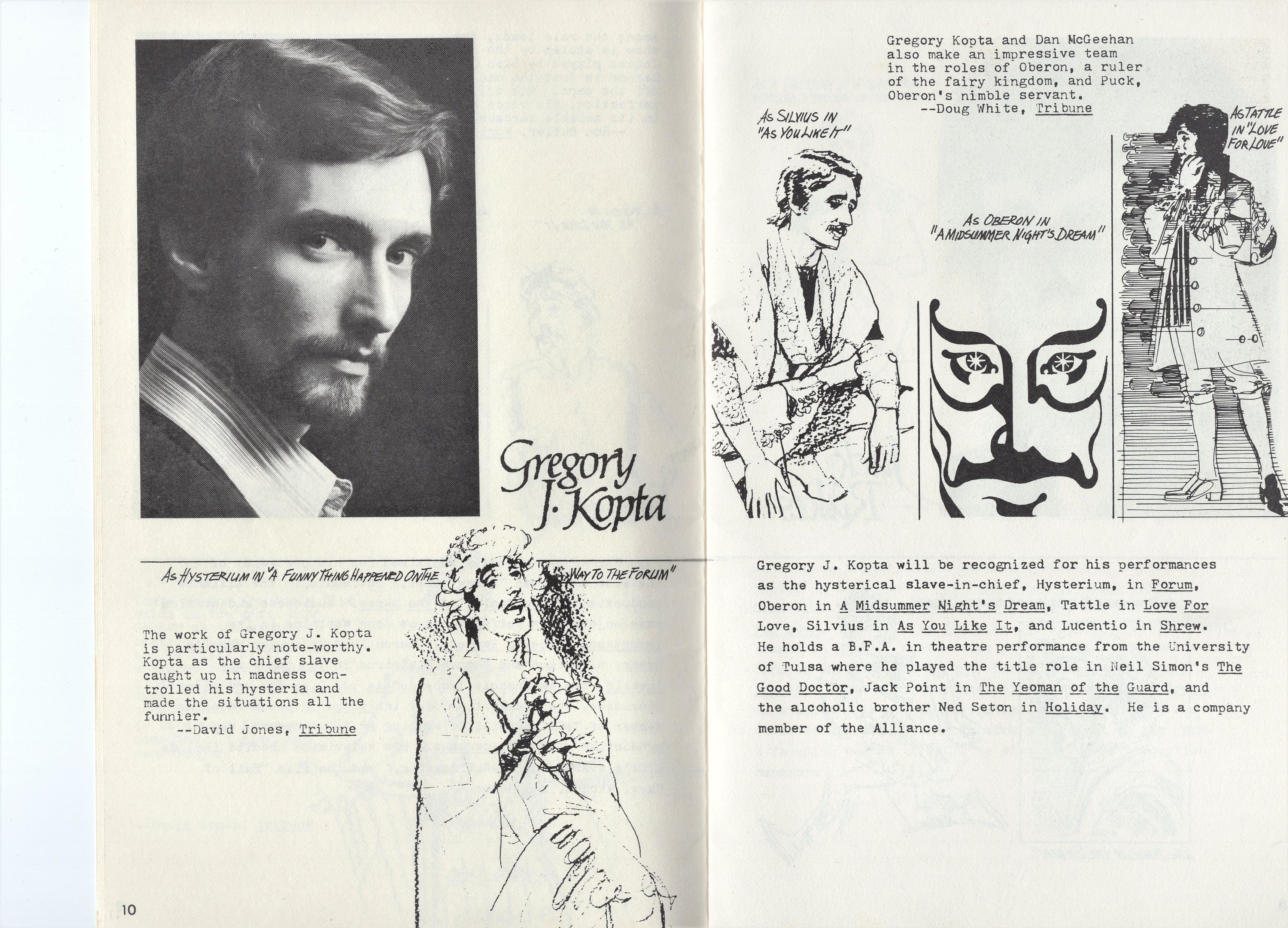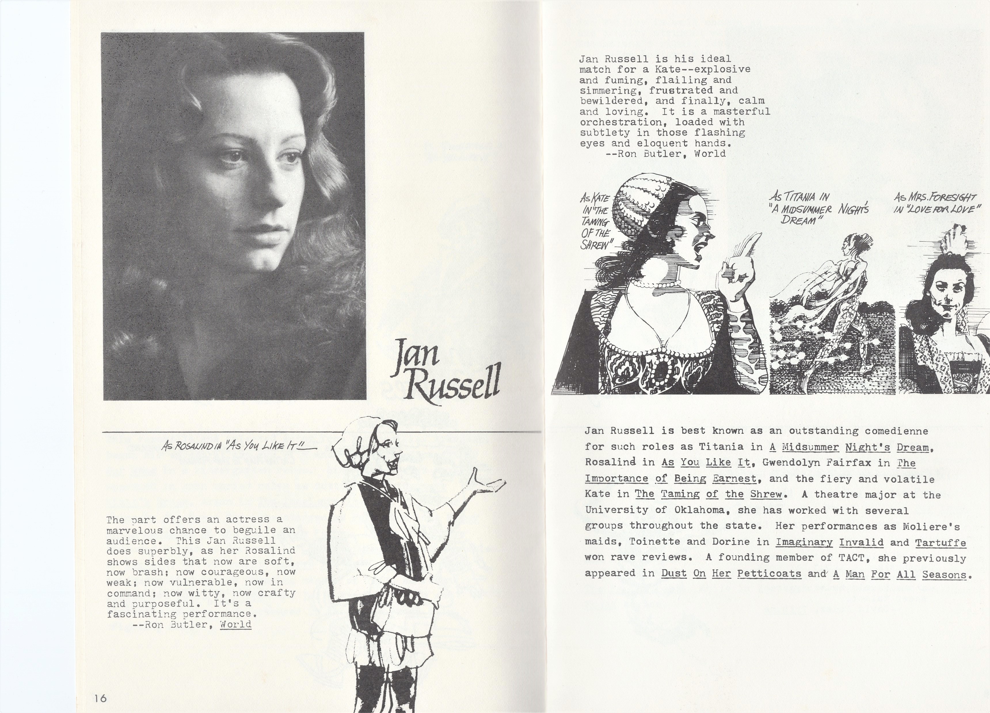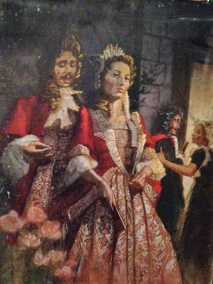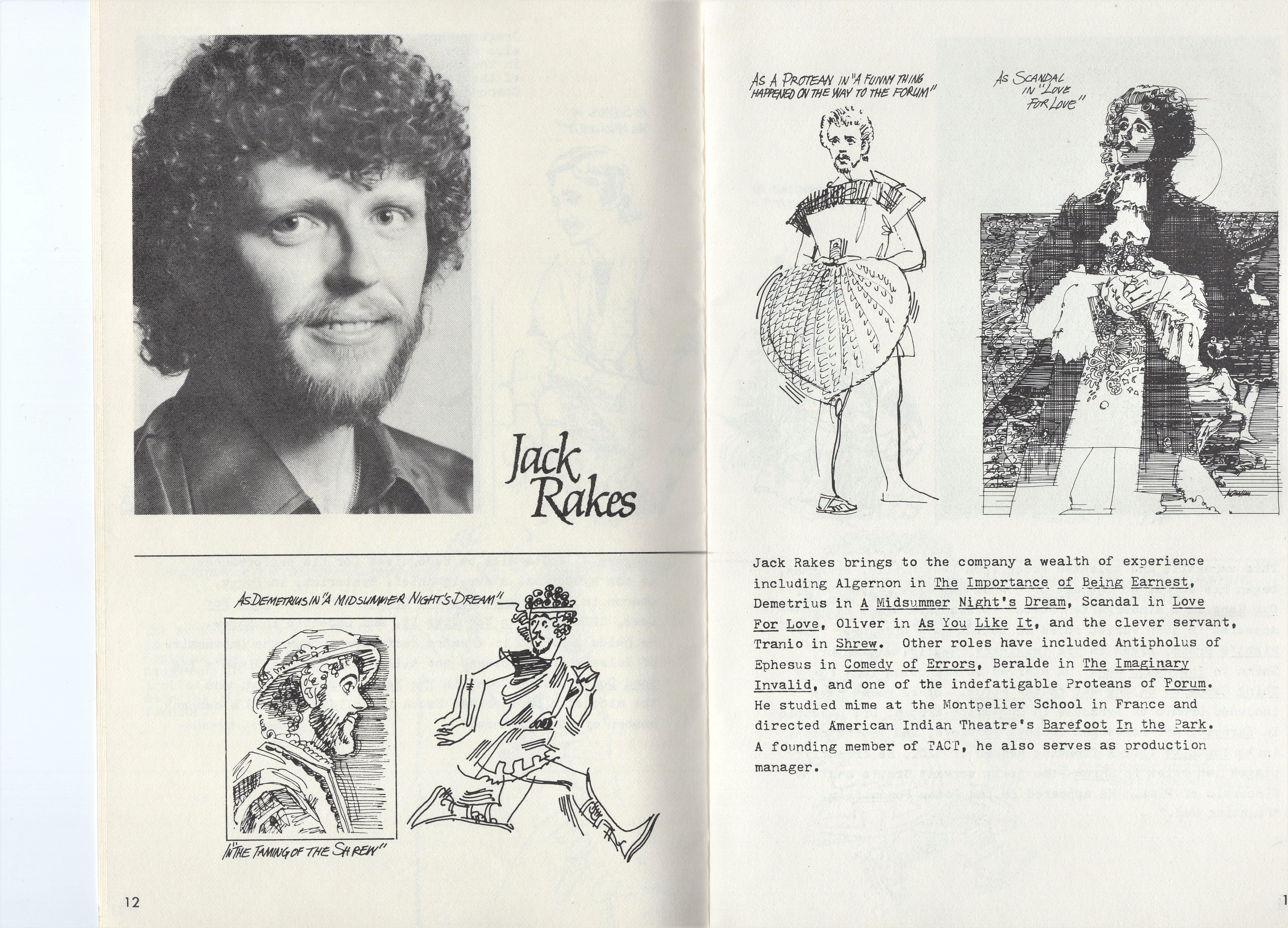 The paintings . . . Many of the images came from slides taken by Deane in the late-70s. But kudos to Shana and Kelsey for rescuing some paintings from the fire’s rubble. It is easy to tell the ones that have yet to be restored! Picture 1 is from The Taming of the Shrew. The two below it are from As You Like It. The others are all Love for Love. Kay reports, “I remember that the background of the Taming of the Shrew painting was made up of the gold wrappers on candy bars that Anne was selling for school or maybe Rainbow (Masonic youth organization for girls). Probably the only time our parents bought a lot of that candy! I think one of the actors or the director got the actual painting.” Note, I don’t I have a copy of that painting, but it looked like the program cover.