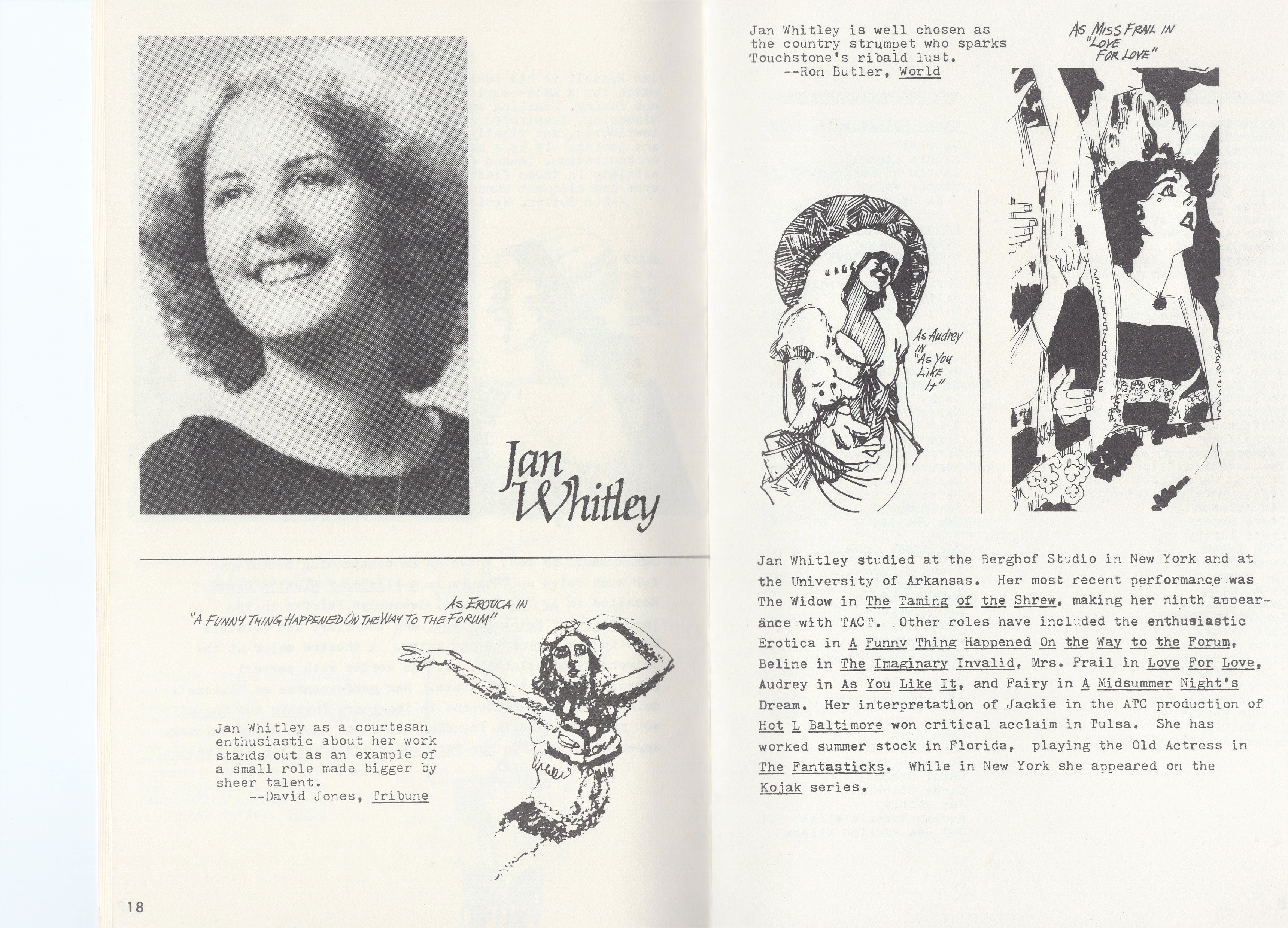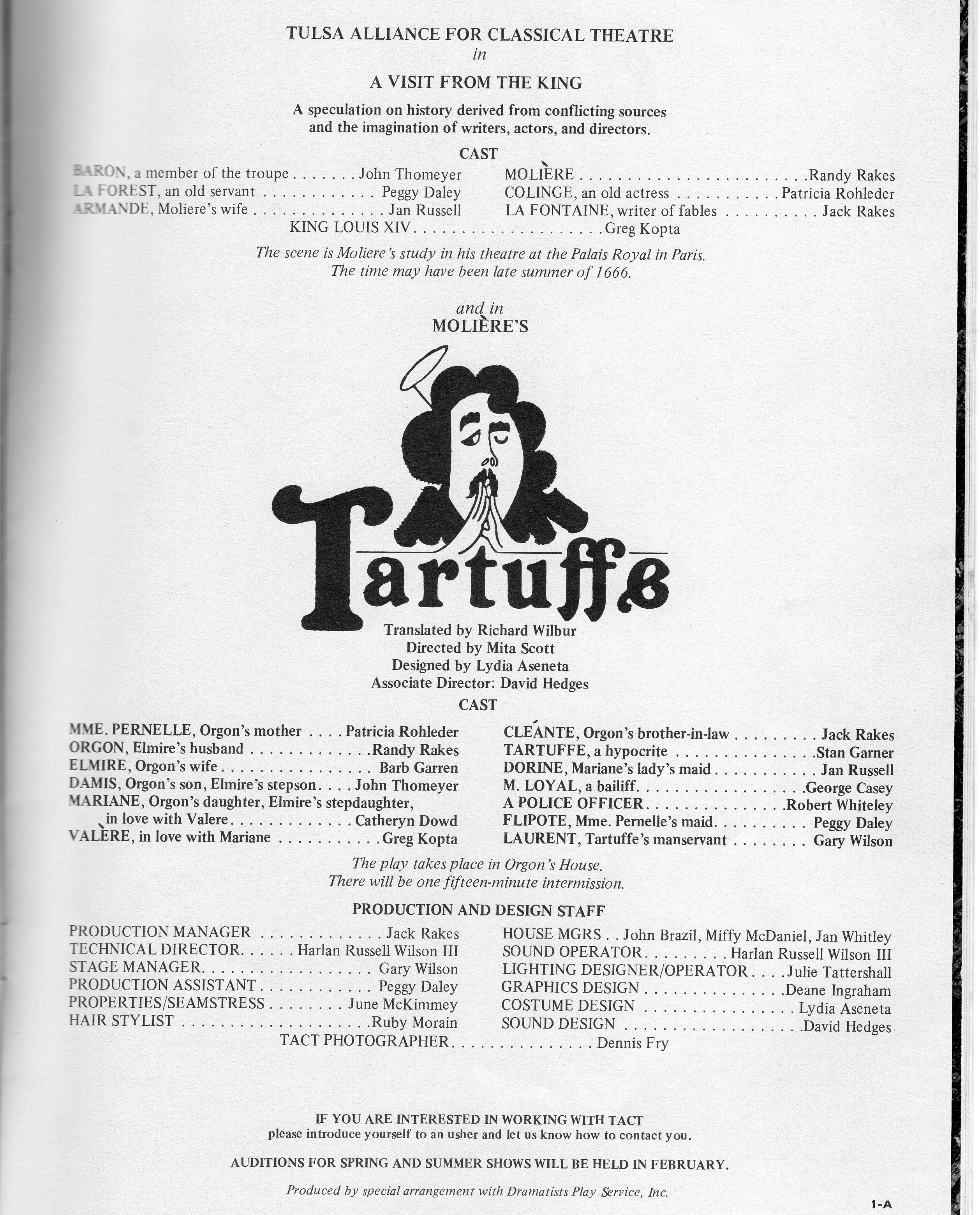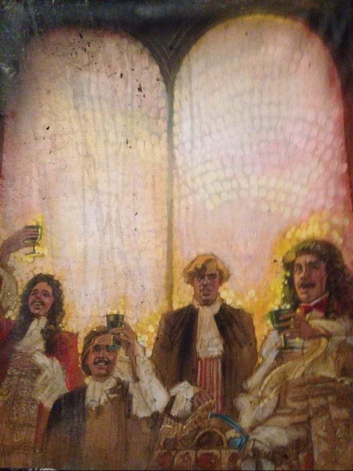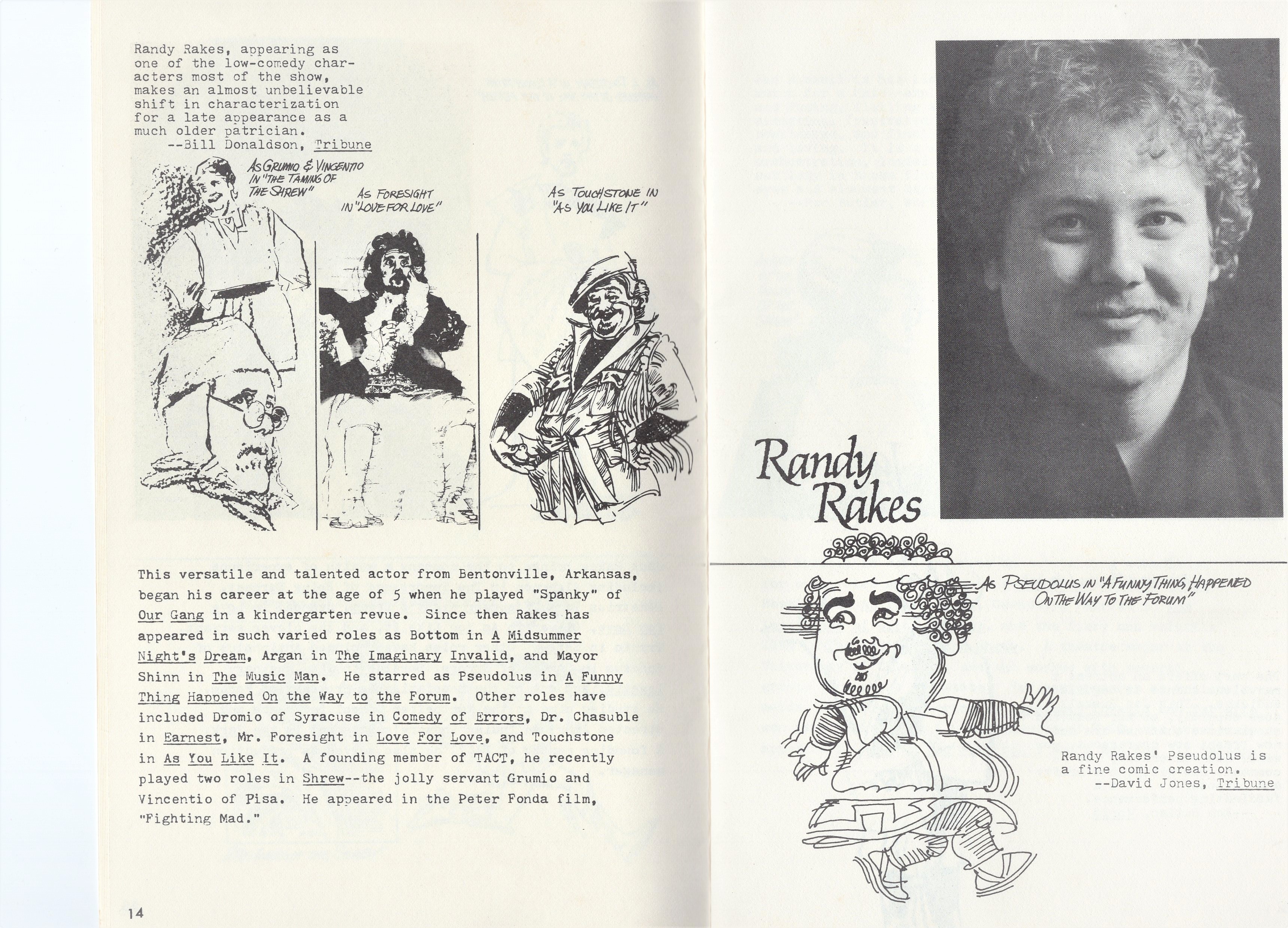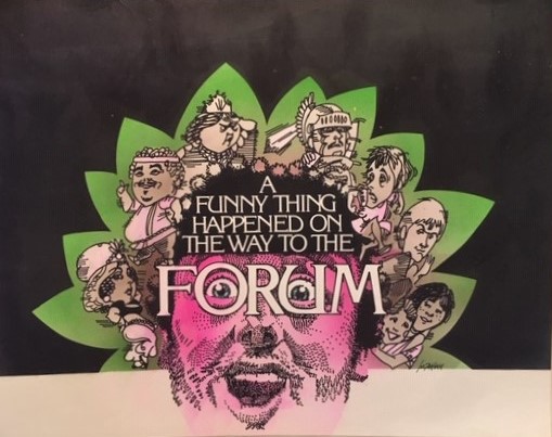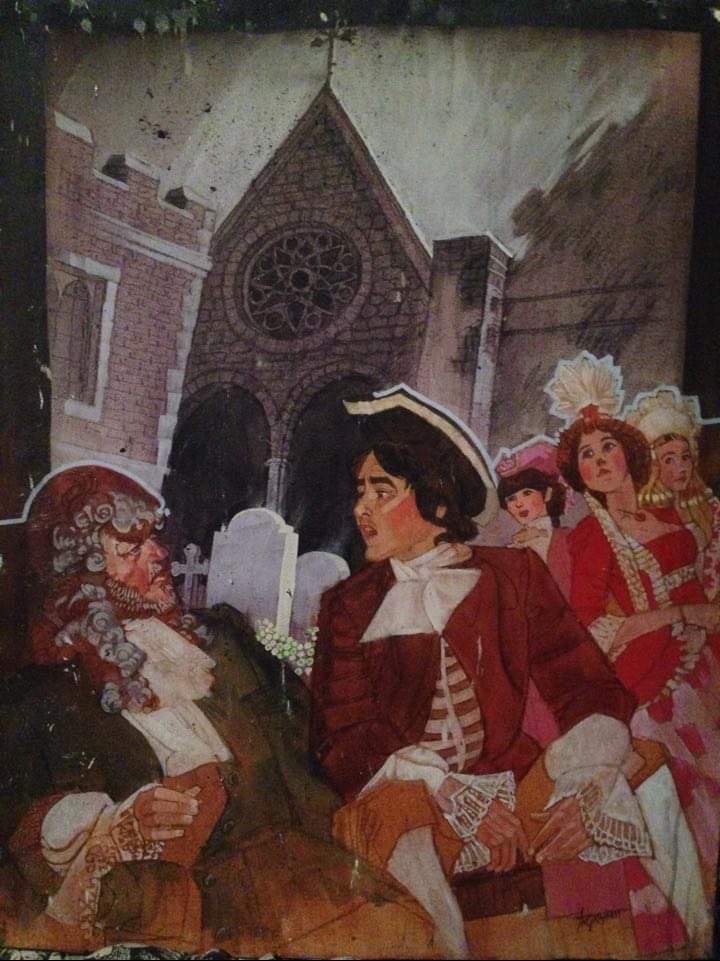 The paintings . . . Many of the images came from slides taken by Deane in the late-70s. But kudos to Shana and Kelsey for rescuing some paintings from the fire’s rubble. It is easy to tell the ones that have yet to be restored! Picture 1 is from The Taming of the Shrew. The two below it are from As You Like It. The others are all Love for Love. Kay reports, “I remember that the background of the Taming of the Shrew painting was made up of the gold wrappers on candy bars that Anne was selling for school or maybe Rainbow (Masonic youth organization for girls). Probably the only time our parents bought a lot of that candy! I think one of the actors or the director got the actual painting.” Note, I don’t I have a copy of that painting, but it looked like the program cover.