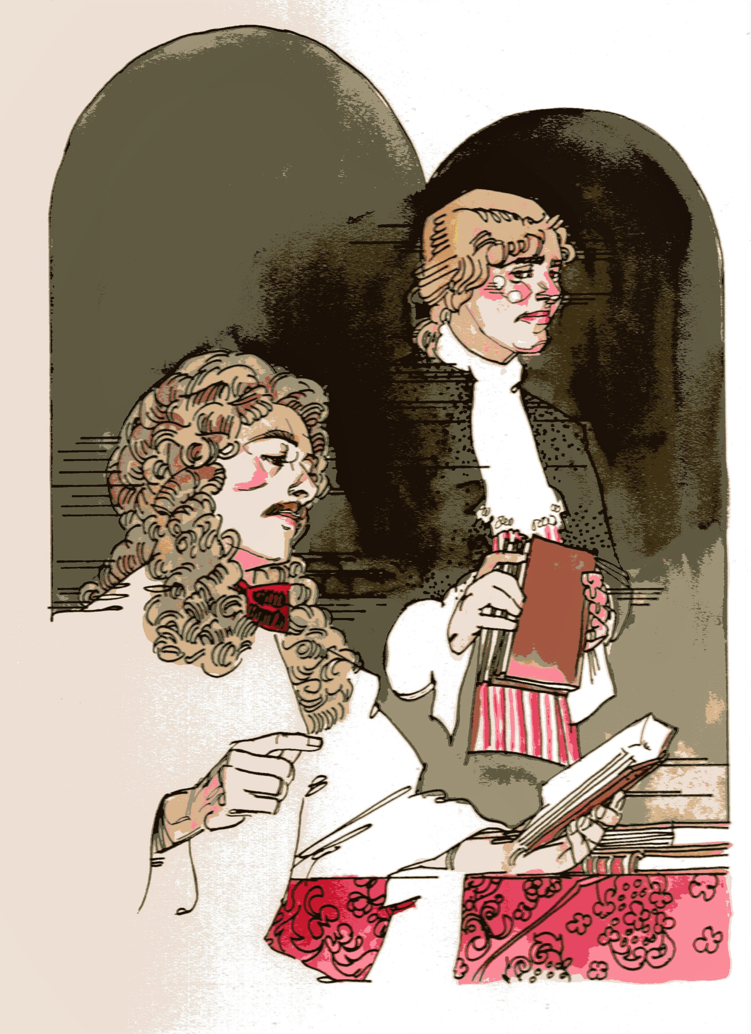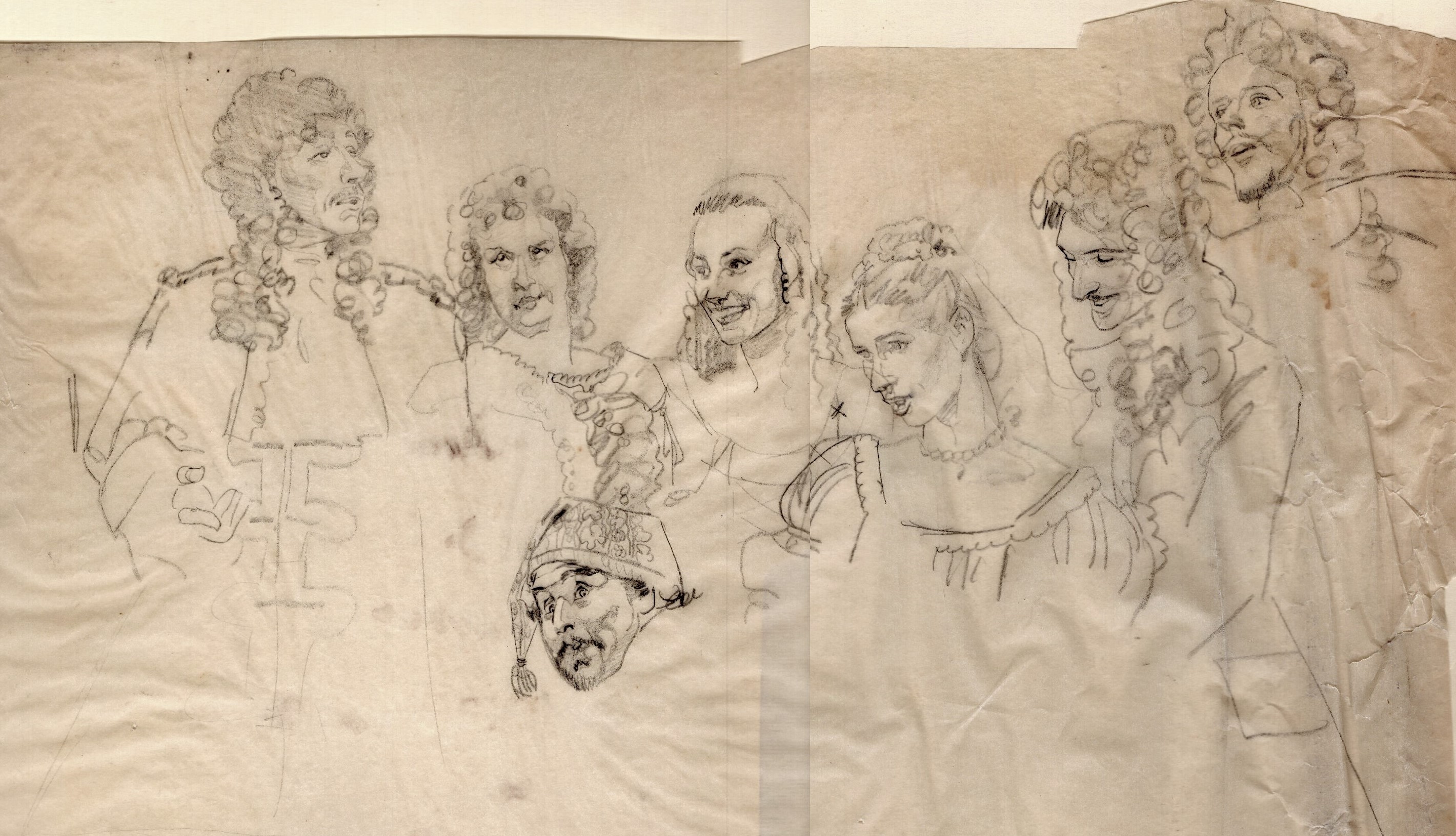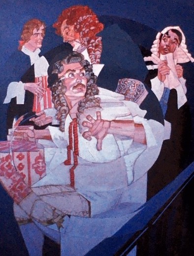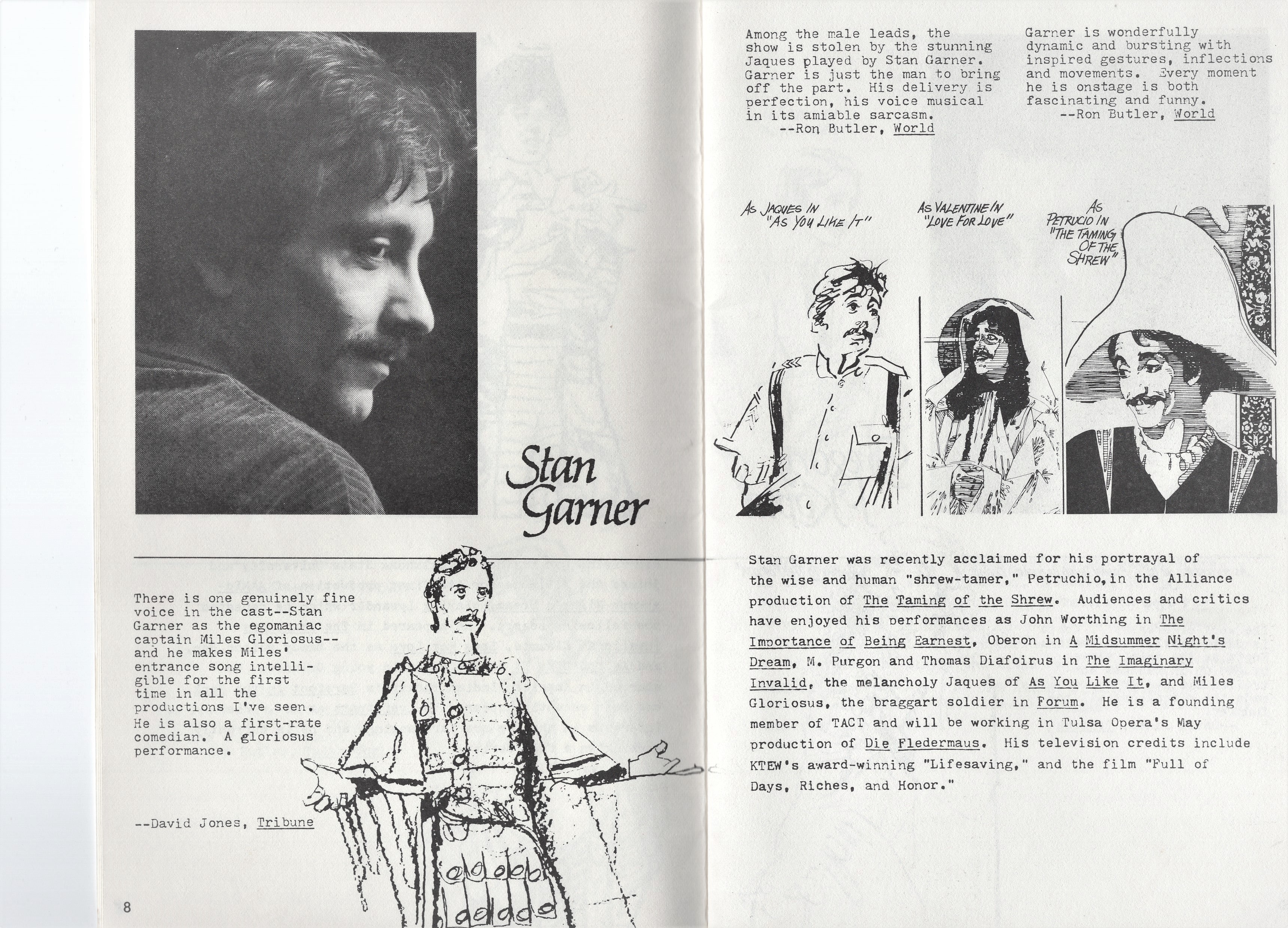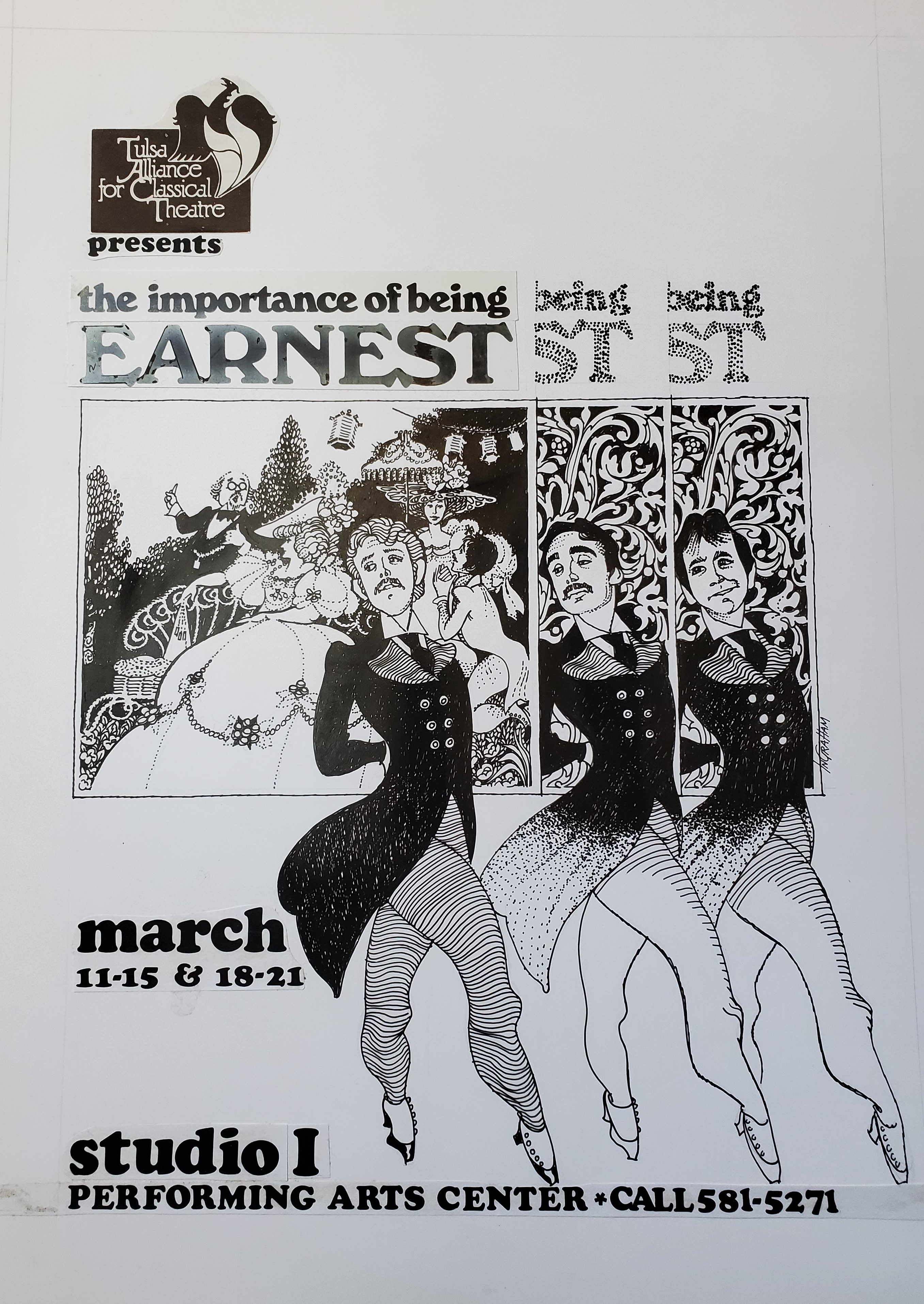 The paintings . . . Many of the images came from slides taken by Deane in the late-70s. But kudos to Shana and Kelsey for rescuing some paintings from the fire’s rubble. It is easy to tell the ones that have yet to be restored! Picture 1 is from The Taming of the Shrew. The two below it are from As You Like It. The others are all Love for Love. Kay reports, “I remember that the background of the Taming of the Shrew painting was made up of the gold wrappers on candy bars that Anne was selling for school or maybe Rainbow (Masonic youth organization for girls). Probably the only time our parents bought a lot of that candy! I think one of the actors or the director got the actual painting.” Note, I don’t I have a copy of that painting, but it looked like the program cover.