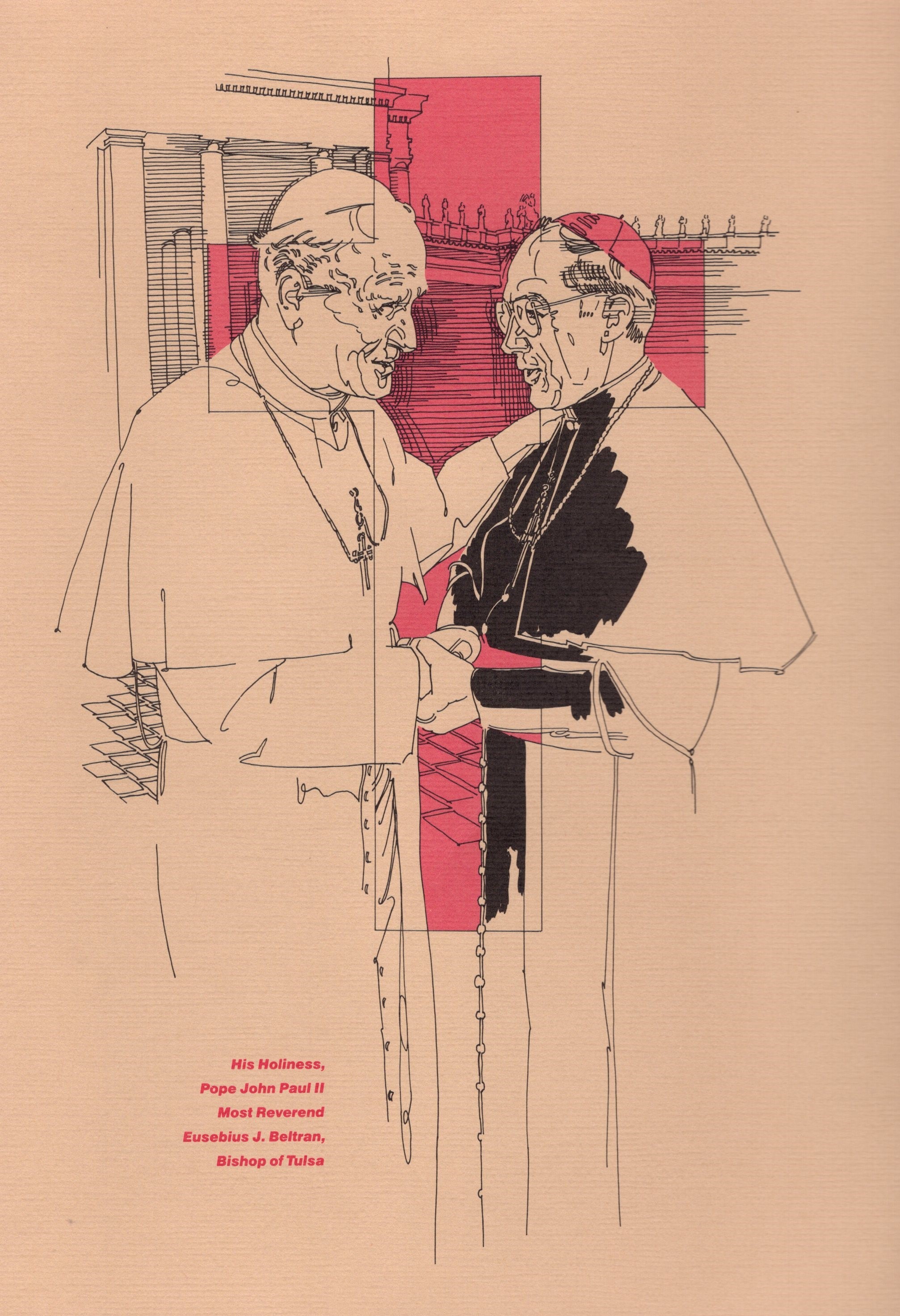 Deane was commissioned to create art for the Catholic Foundation of Eastern Oklahoma engagement calendars of 1987 and 1988. Pope John Paul II was probably the most important person Deane ever had to draw. And yes, most likely drawn from a photograph.