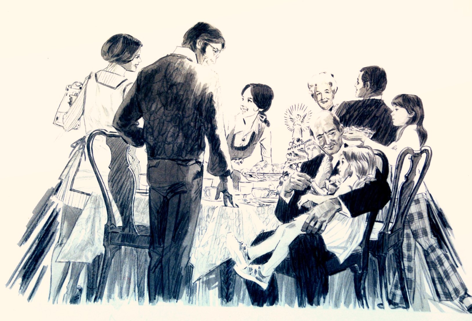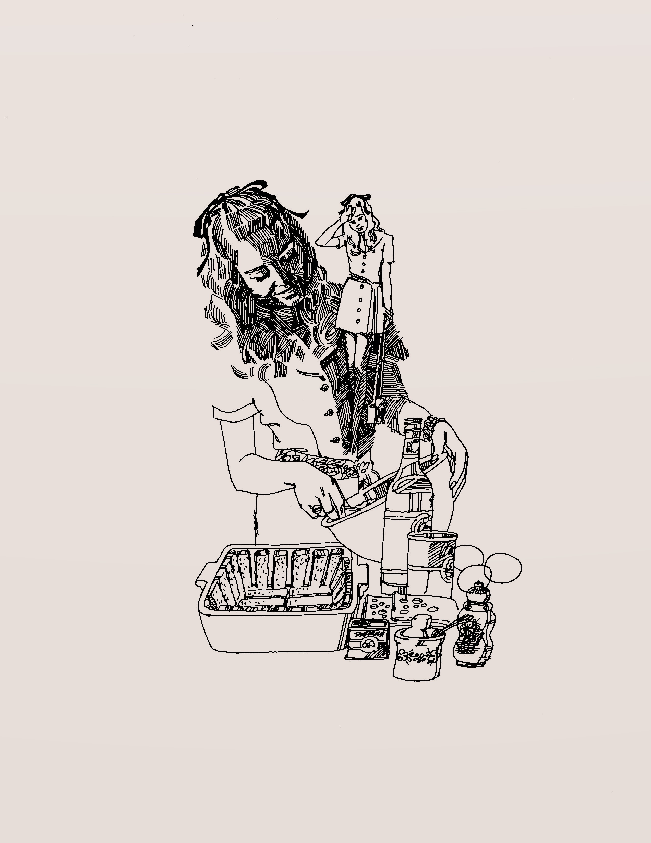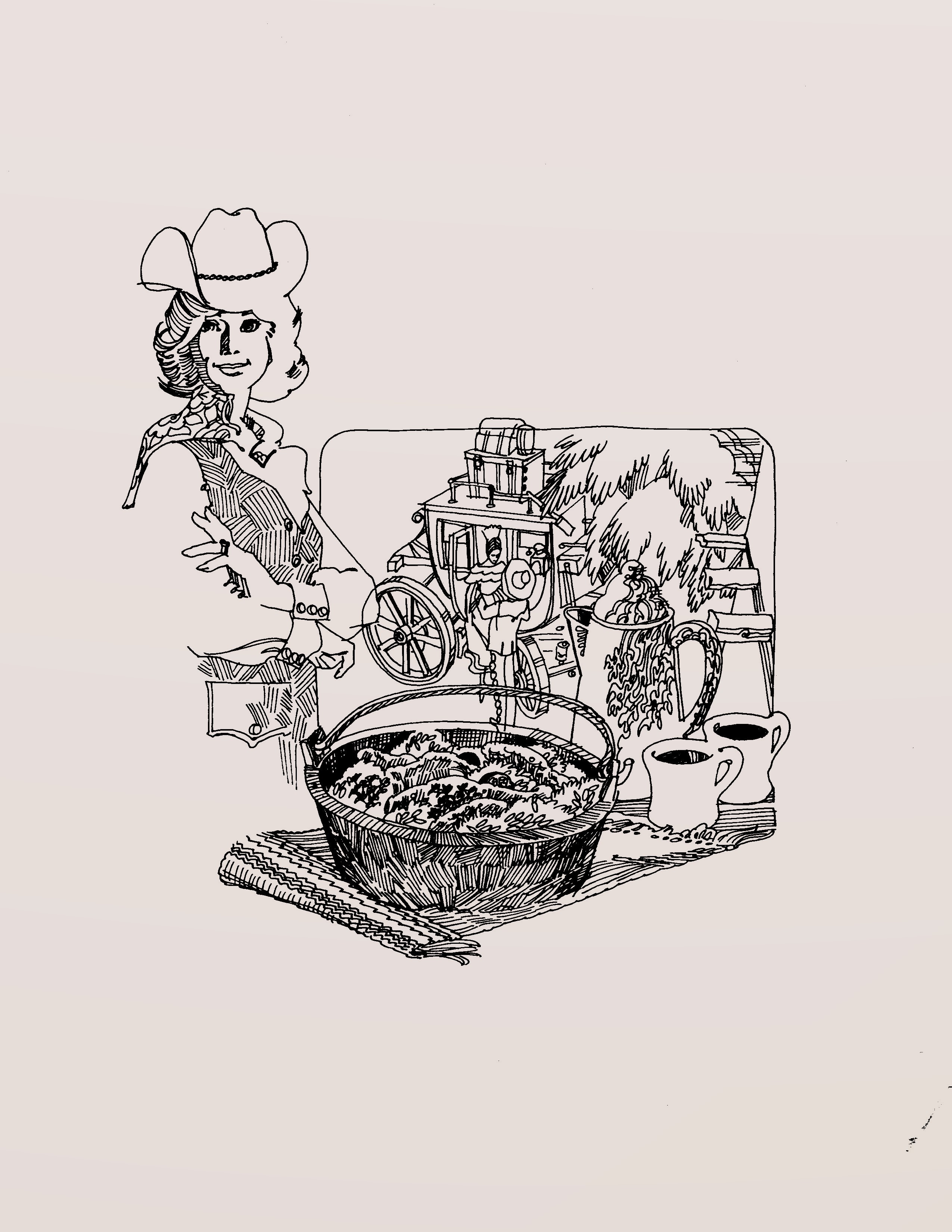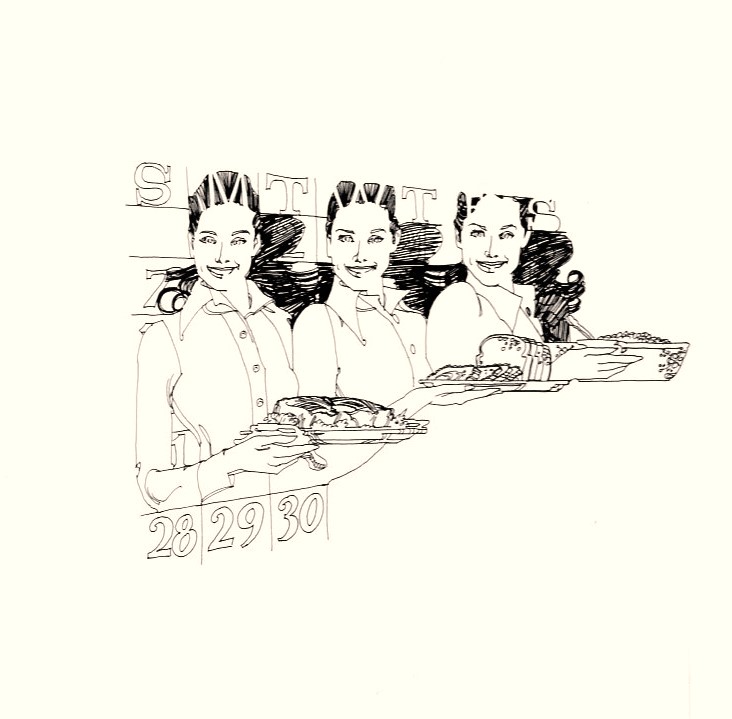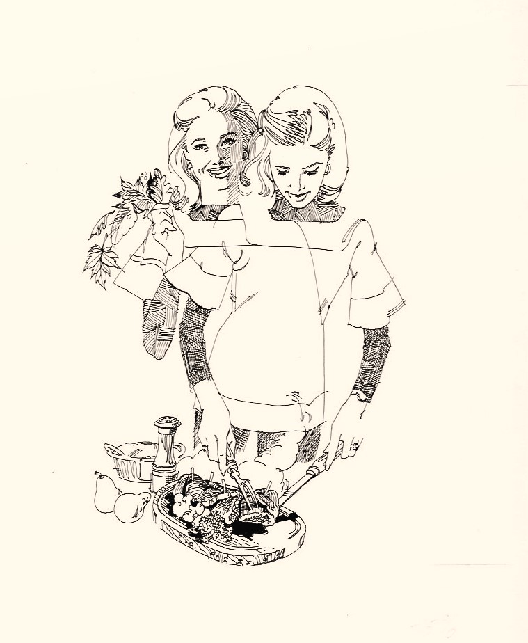 In 1972-1973, Deane was commissioned to add art to serial menus sponsored by Sipes Grocery. The menus were titled Girl on the Go! and were 1/4 size page ads located in the Women’s section of the Tulsa World Sunday newspaper. It began on March 5, 1972 and ended November 25, 1973. Ninety-one weeks! The first 52 were compiled into a booklet titled Girl on the Go. It sold for 50 cents a copy. Kay has a copy of the booklet. The slideshow below is some of the art I found for the newspaper series and booklet. Most were on whiteboard that still had pencil marks indicating how much the art should be reduced to fit into the ad. You may not be able to see it because I took the liberty of adding a bit of tint. The whiteboard was looking a bit worn.