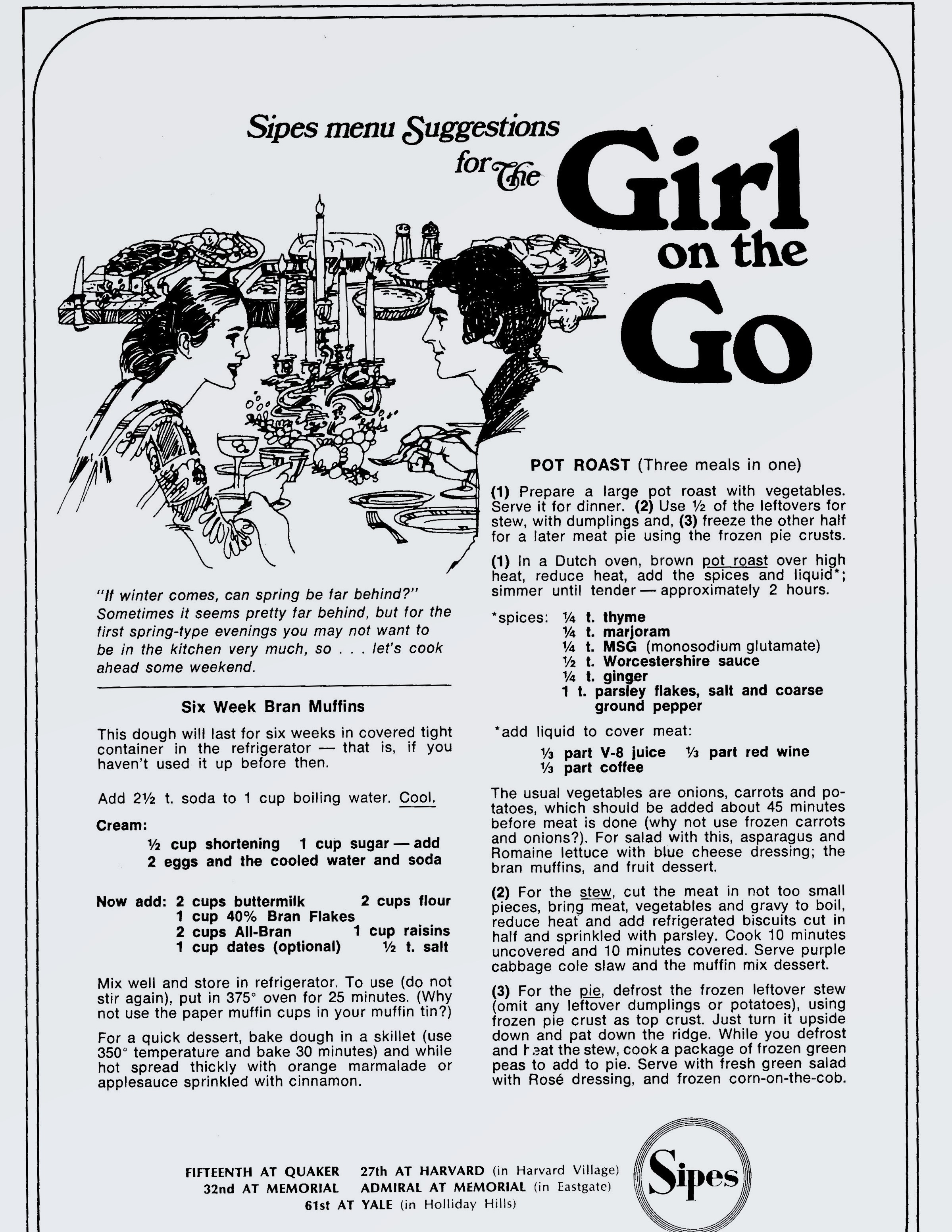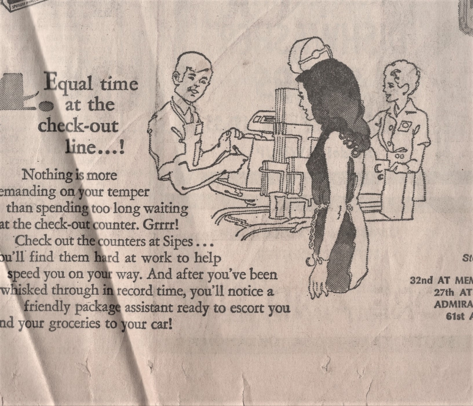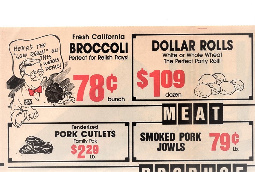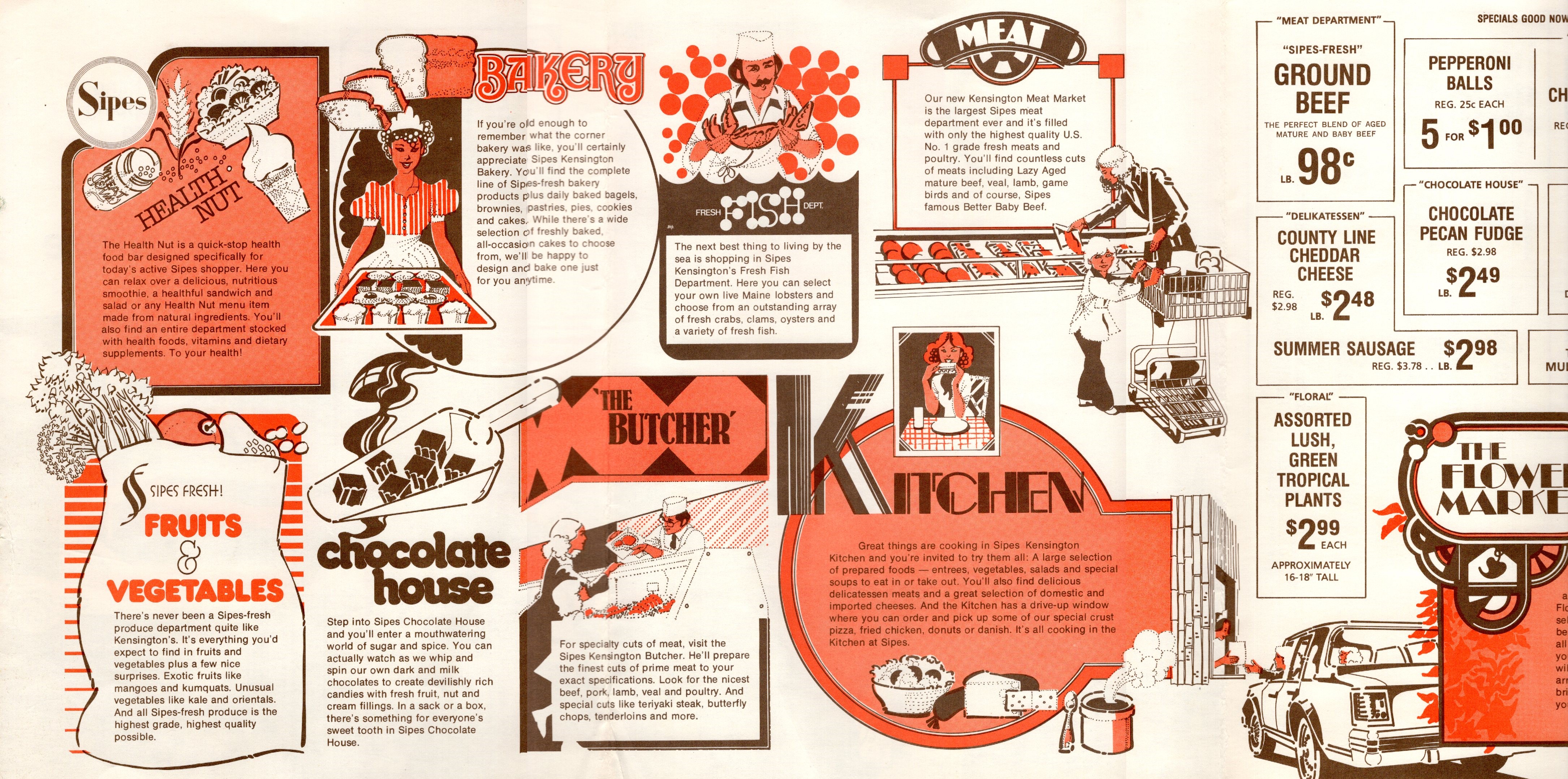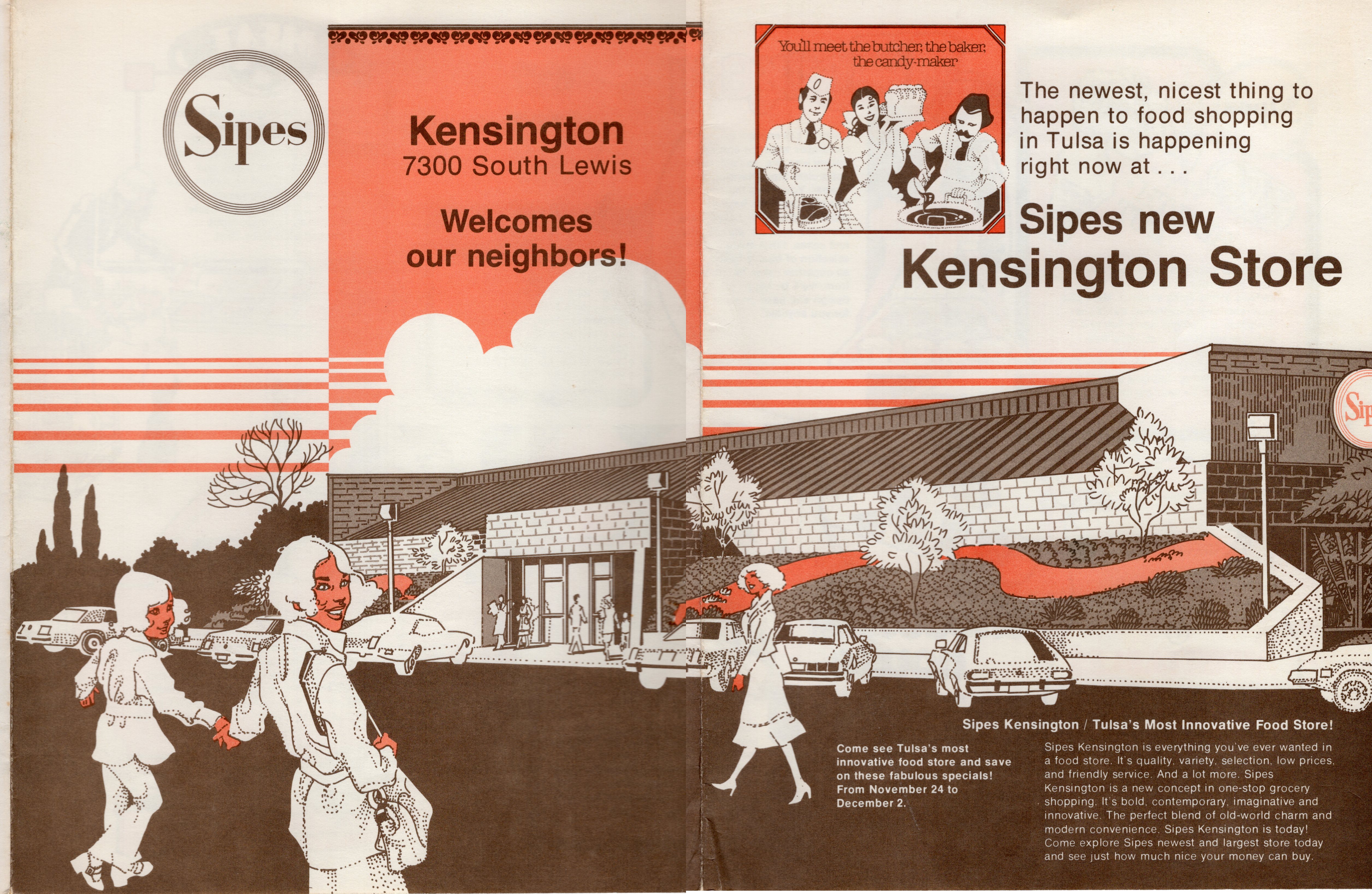 This brochure is advertising the new Sipes grocery store. Jill lived in the apartments nearby July 1987 so the store opened some years before that date. Below is the opened brochure, three panels long!