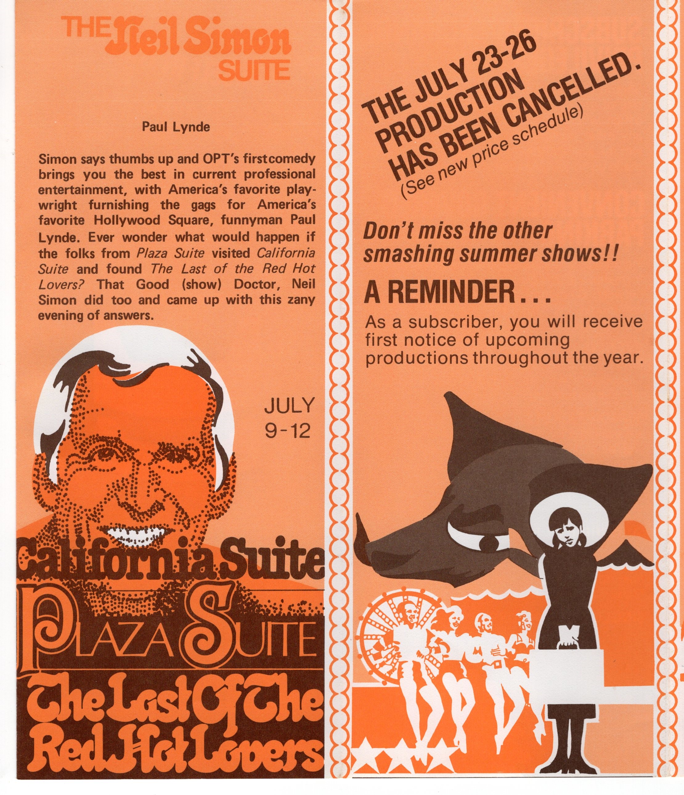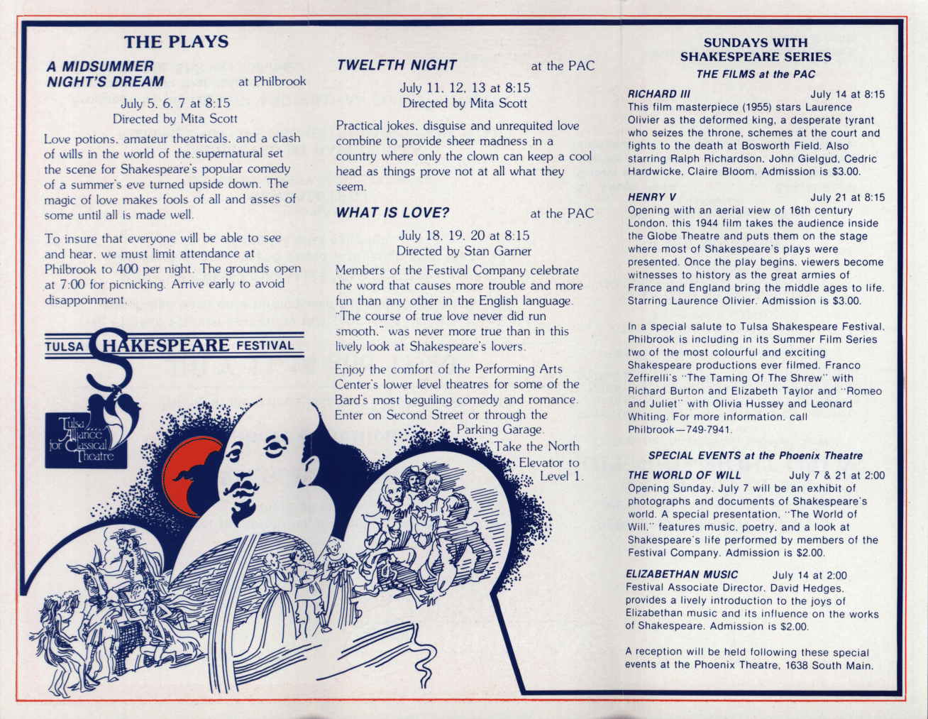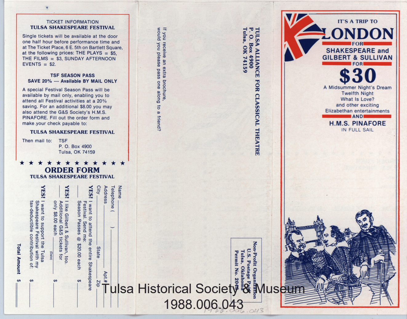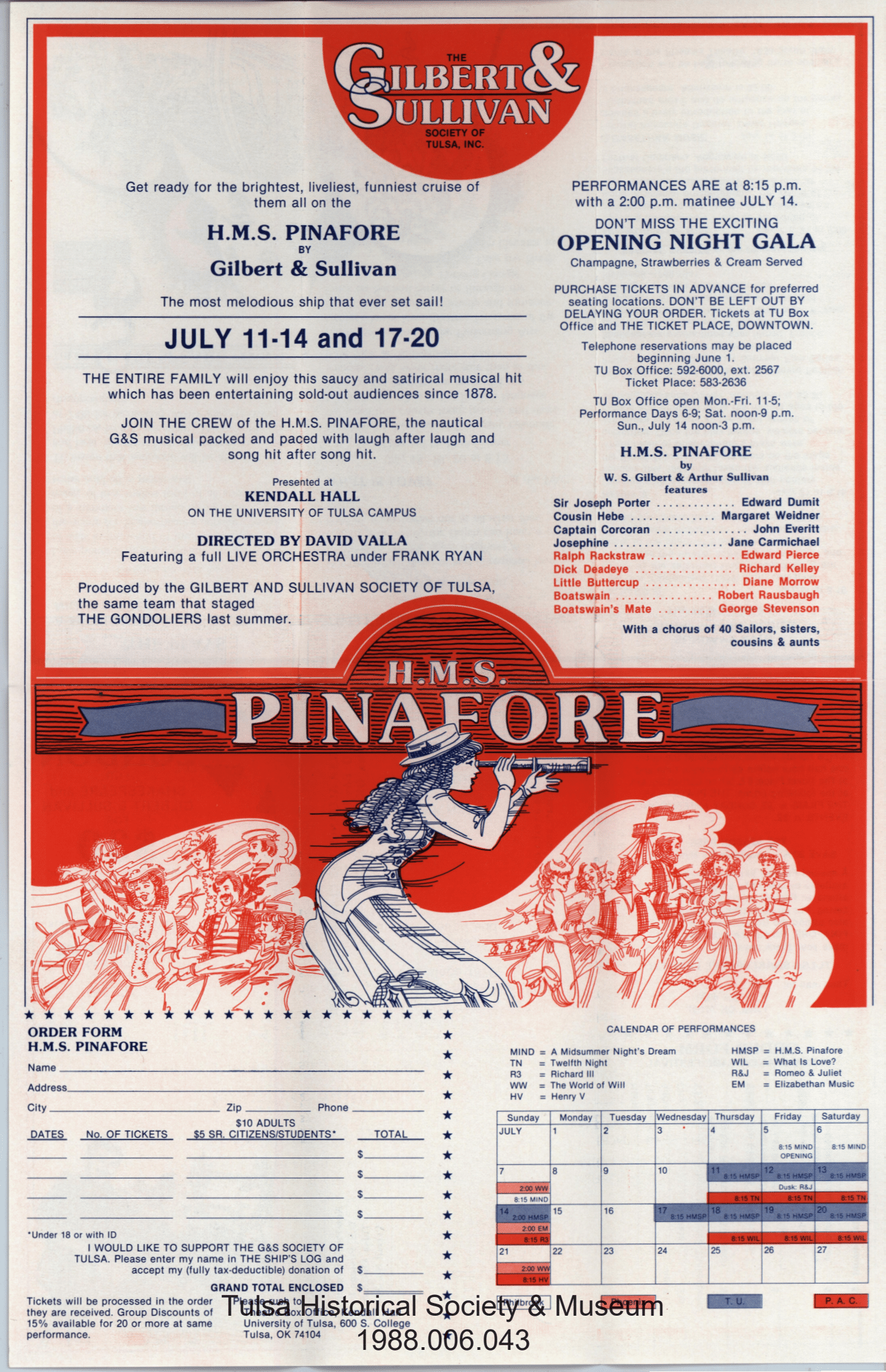 July 11 – 14, 17 – 20, 1985. H.M.S. Pinafore production as part of Shakespeare Festival. This is a large double-fold tri-fold mailing.
