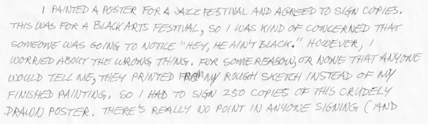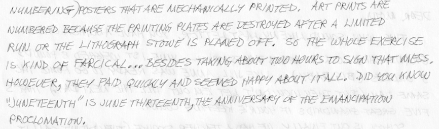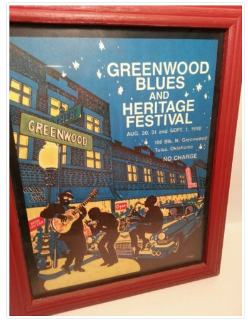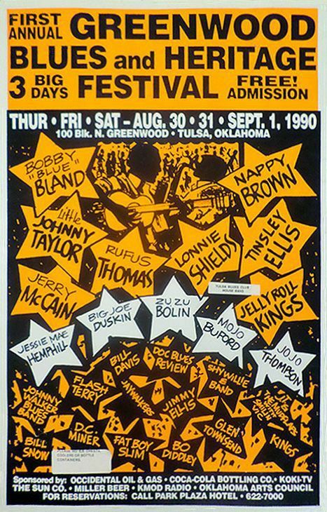 Deane made two posters for Tulsa’s First Greenwood Blues and Heritage Festival. I snipped a portion of a letter he wrote to his mother in June 1990 that relates to the blue poster below.