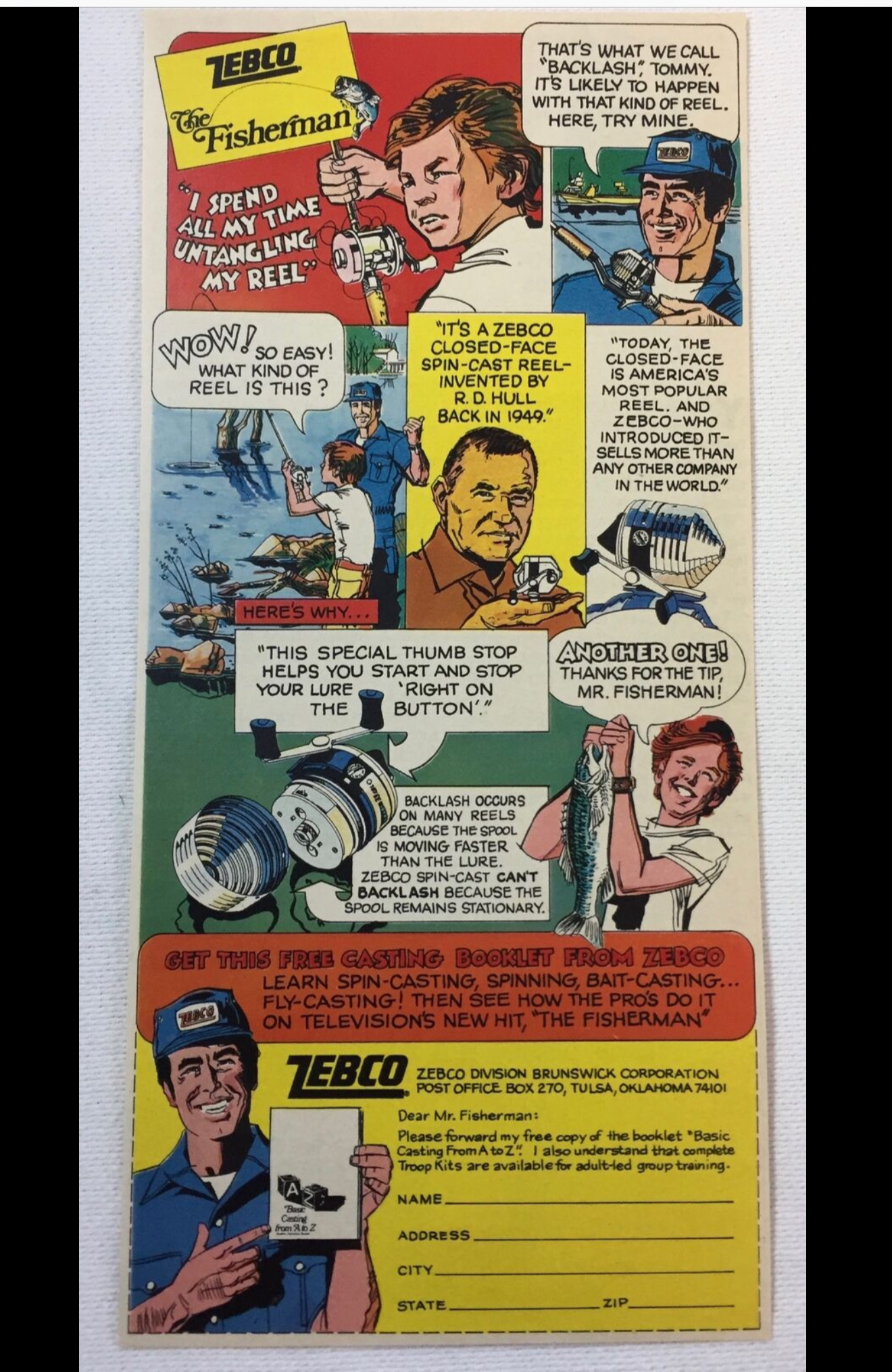 This ad is for the Brunswick Corporation. Brunswick Corp. has a much longer history, beginning in 1845, making carriages and billiard tables. They acquired ZEBCO at one point but now ZEBCO’s parent company is Rather Outdoors.